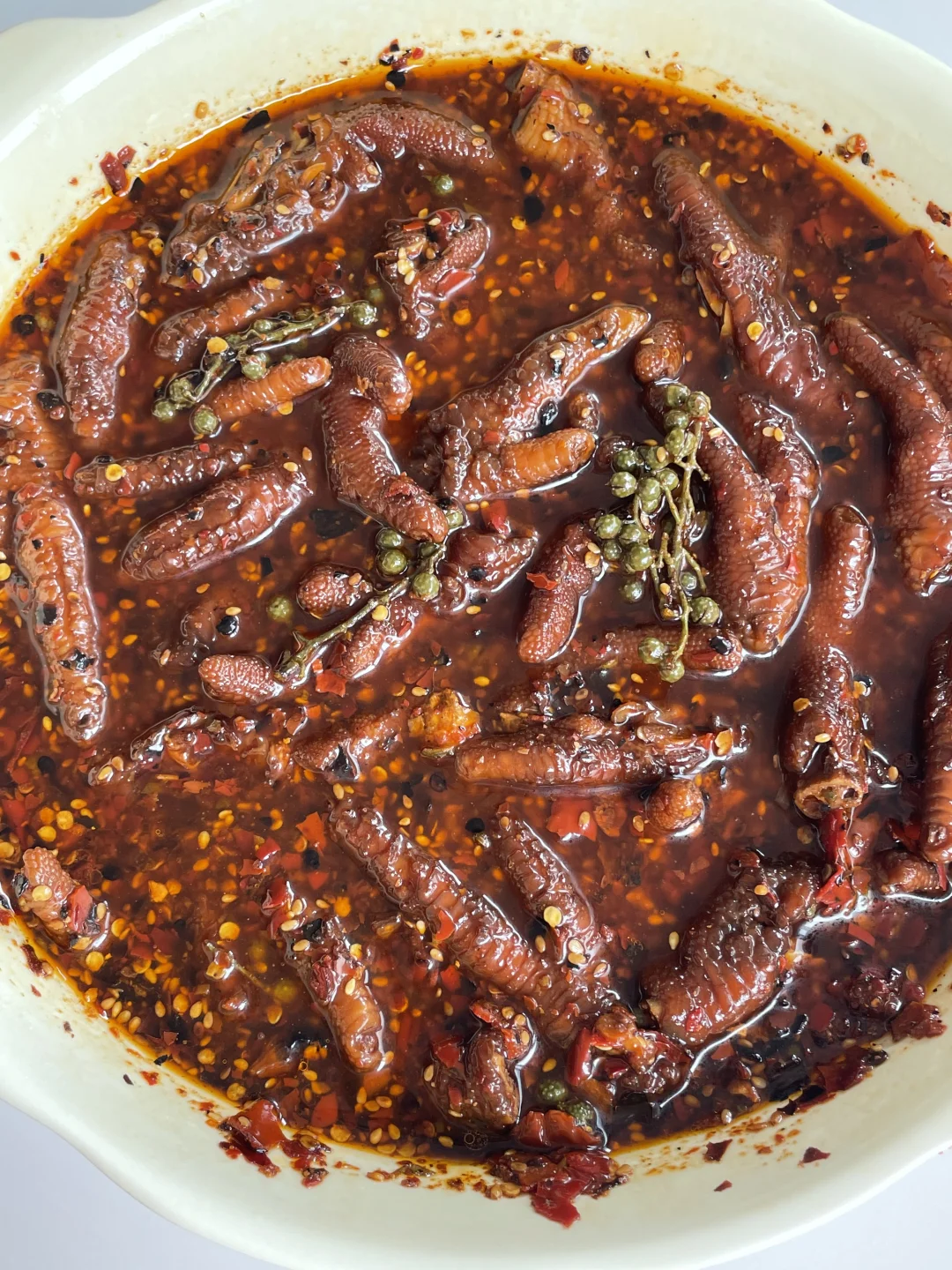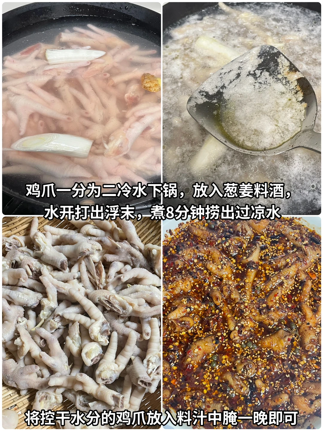 3⃣️鸡爪一分为二,冷水下锅,放入葱姜、料酒,水开打出浮沫,煮8分钟,捞出过凉水,将鸡爪控干水分,再放入刚才准备好的料汁中腌一晚。即可得到非常美味的糊辣壳鸡爪,做法是不是真的很简单,但是真的巨好啃[流泪],不管是看电视还是外出野餐都是不错的选择,喜欢的姐妹可以尝试做一做。