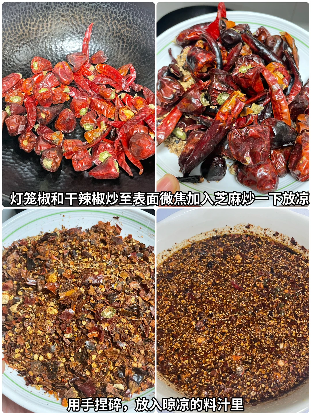 2⃣️将灯笼椒和干辣椒(不能吃辣的放二荆条)炒至表面微焦,加入芝麻。炒一下,然后放凉,用手将辣椒捏碎,放入放凉的料汁里拌匀备用。