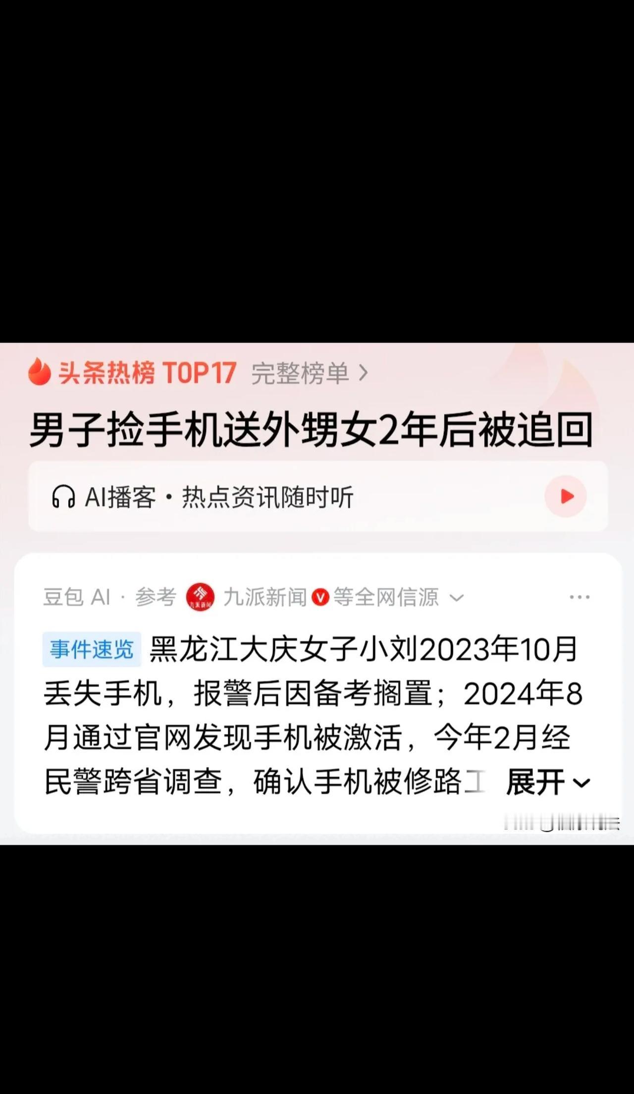 黑龙江大庆,2年前,男子捡到一部苹果手机,刷机后送外甥女了,不料,2年后,失主在官网发现手机被激活,立即报警,民警跨省找到手机,经调解,男子赔偿失主8500元,而这8500的赔偿包含3个部分,让人有点意外。网友:这钱都够买一个新的了! 事情起因特别简单:2023年10月,女生小刘购物时不慎弄丢苹果手机,当时她正忙着备考,手机里还有未备份的准考证、重要资料,急得手心冒汗,报警后也只能暂时搁置,这一悬心就是两年。 直到2024年8月,小刘抱着试试的心态登官网,竟发现丢失的手机被激活了!顺着这条线索,警方耗时半年多,终于在2026年2月找到了手机使用者——捡手机男子的外甥女。 原来当年手机是一名修路工人捡到的,看到是苹果手机,心里一贪,直接刷机解锁当礼物送了人,压根没觉得这是犯法,直到民警上门,才慌得手足无措。 最终调解赔偿8500元,明细一公开,争议直接拉满: 6000元手机本金+2000元资料损失+500元寻机费用,一分不多一分不少,全是小刘的实际损失。 网友们的看法,简直说出了大家的心里话: ✅心疼捡手机男子的: “又不是偷的抢的,就是捡的,赔8500都能买台全新的了,也太亏了吧!” “以后谁还敢捡手机?万一被讹上,直接扔路边算了!” “都过去两年了,失主早该换新机了,这赔偿纯属狮子大开口!” ✅力挺失主小刘的: “一点不冤!捡东西不还本来就缺德,还私自刷机毁人资料,换谁都得要赔偿!” “两年的精神焦虑、来回跑着找手机的花费,还有 irreplaceable 的资料,8500真不多!” “别拿捡来当借口,法律都规定了拾得遗失物必须归还,这是常识!” 作为旁观者,我真的想说句公道话: 一开始我也觉得8500赔偿偏高,可细想之后,完全合情合理! 首先,别再抱着“捡到就是赚到”的老观念了!《民法典》明确规定,拾得遗失物必须返还权利人,私自刷机、赠送他人,属于无权处分,手机价值6000元,拒不归还甚至可能构成侵占罪,男子没被追责,只是赔钱,已经是万幸。 其次,现在的手机早就不是单纯的通讯工具!里面的个人资料、备考信息、隐私回忆,根本没法用金钱折旧衡量,刷机等于直接销毁了别人的重要资产,这2000元资料补偿,一点都不夸张。 最后,失主这两年的提心吊胆、配合警方调查的奔波,500元寻机开销,都是实打实的付出。 说白了,这8500元赔的不是手机,是法律底线+道德良知。 贪小便宜吃大亏,这句话永远不过时。本来捡到手机上交派出所,几分钟的事,既心安又不担责,非要心存侥幸,最后倒贴几千块,还落个坏名声,到底图啥? 老话讲拾金不昧,从来不是道德绑架,而是保护自己、尊重他人的最好方式。 最后问问大家:你觉得捡手机赔8500元,到底合理吗?评论区留下你的看法!