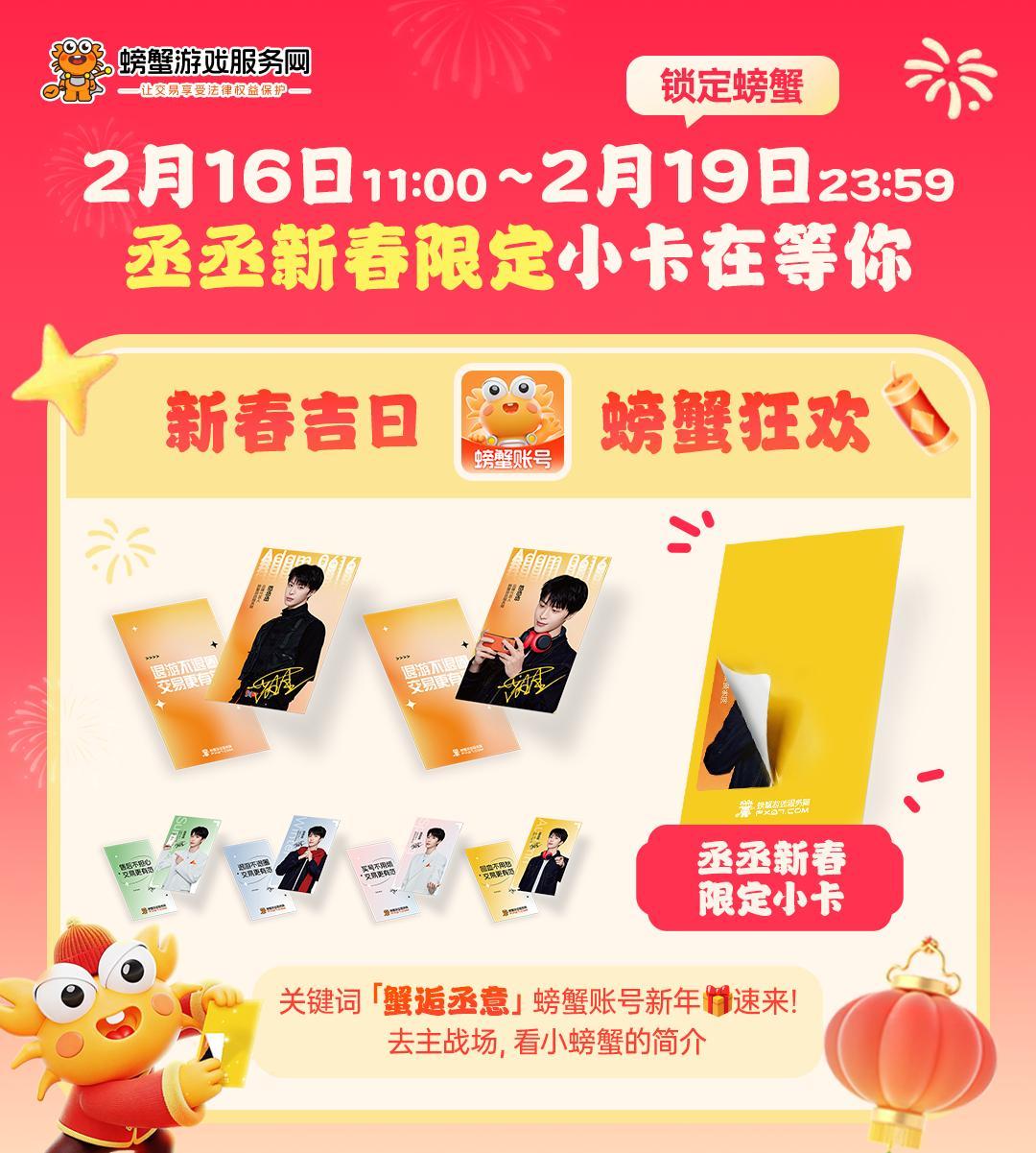 随「丞」想呢,新年没收到公司的年货,但是却收到螃蟹账号和范丞丞给我带来的惊喜丞丞这个新春限定小卡谁看谁迷糊!2.16-2.19,每天到螃蟹账号都可以抽取范丞丞新春限定小卡,做任务还可以增加抽奖机会,别管我了,我要开始为范丞丞的小卡发力了!上螃蟹抽范丞丞新春限定 螃蟹账号 范丞丞 螃蟹互娱