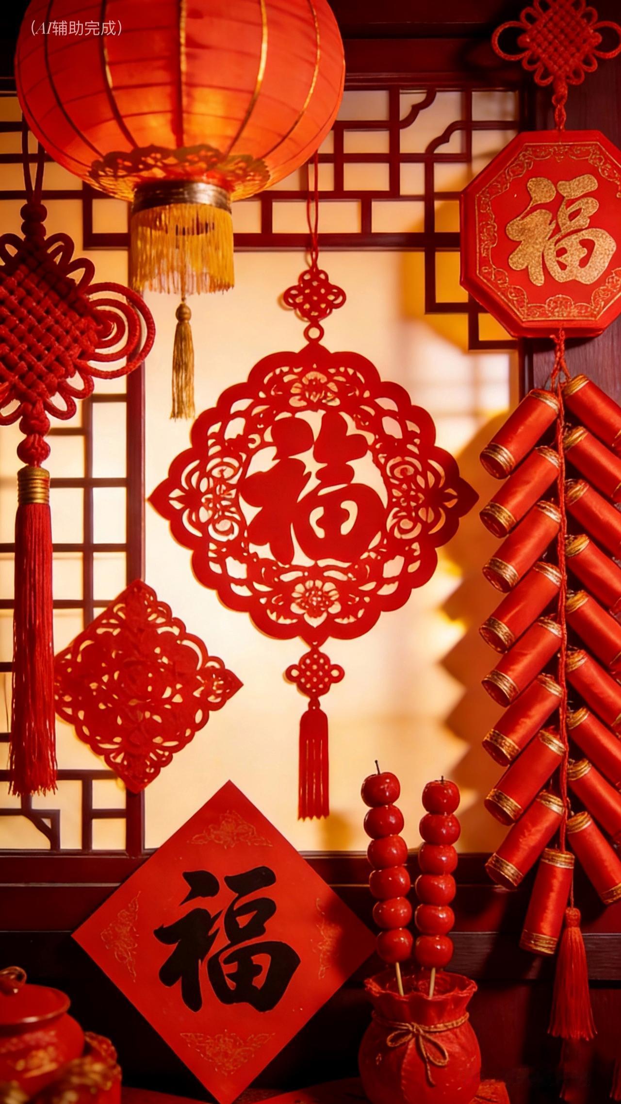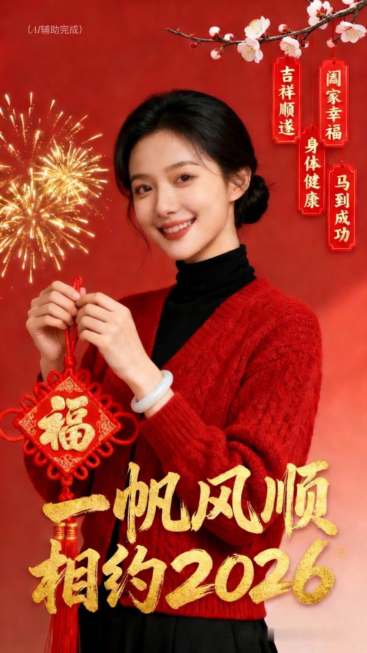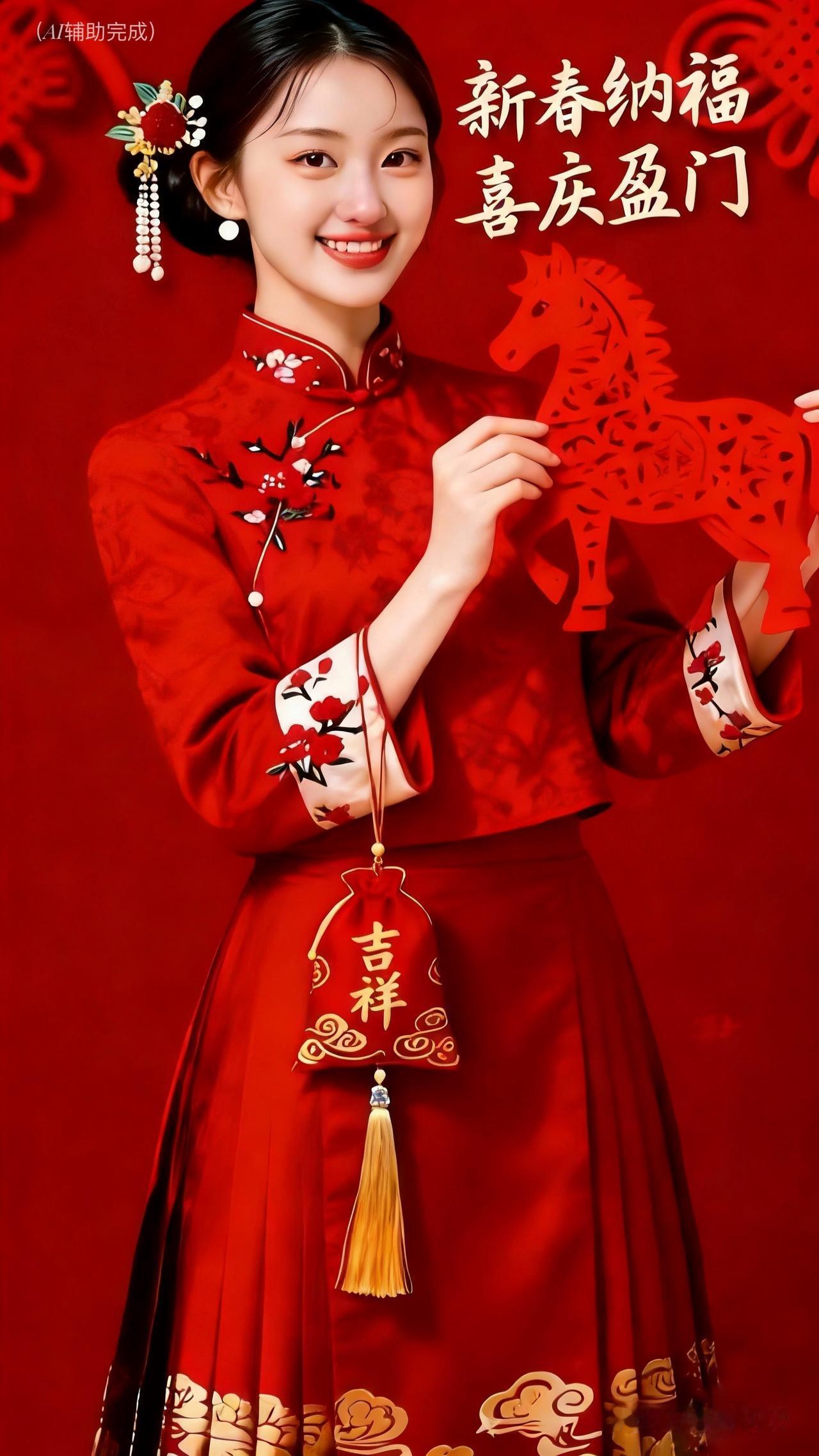 红衣绣梅盘发雅,玉镯轻晃添温婉。手捧马形剪纸/福字中国结,眉眼弯弯笑靥甜,如梅绽