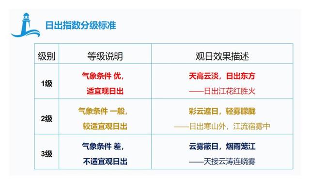 一级表示气象条件优,适宜观日出。观测者可以看到天高云淡、日出东方,感受“日出江花红胜火”的壮美。