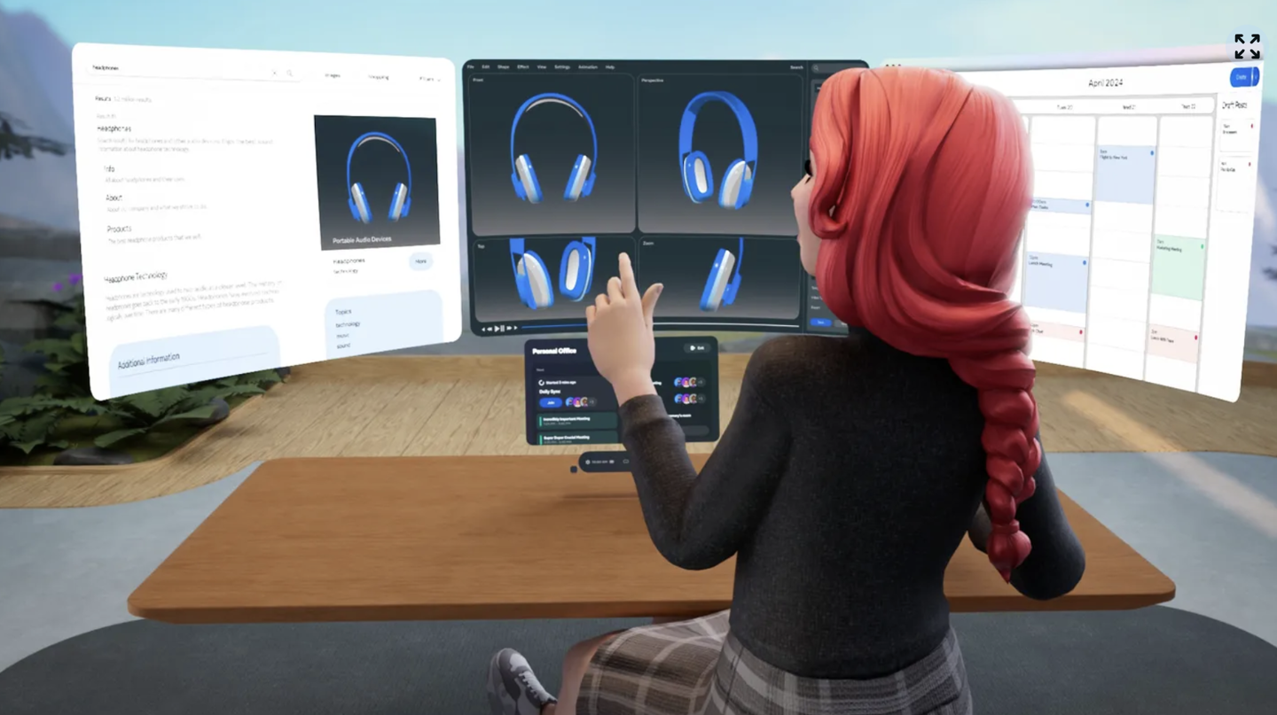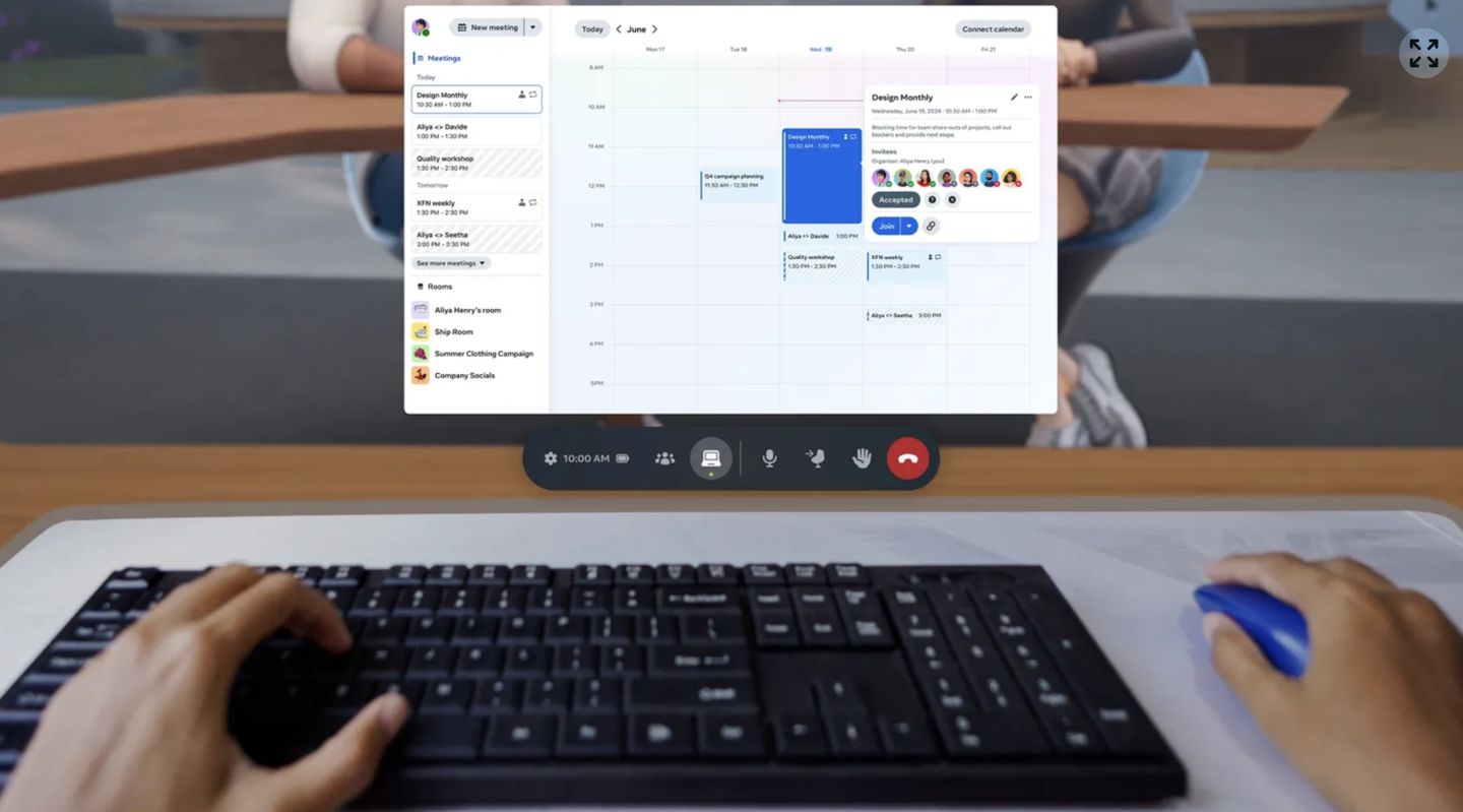 用户可以HorizonWorkrooms提供的3D会议聊天室中与其他同事共享电脑屏幕、传输文件、利用虚拟白板写字绘画。同时即便没有Quest设备的用户,也可通过网页端以摄像头方式加入会议。