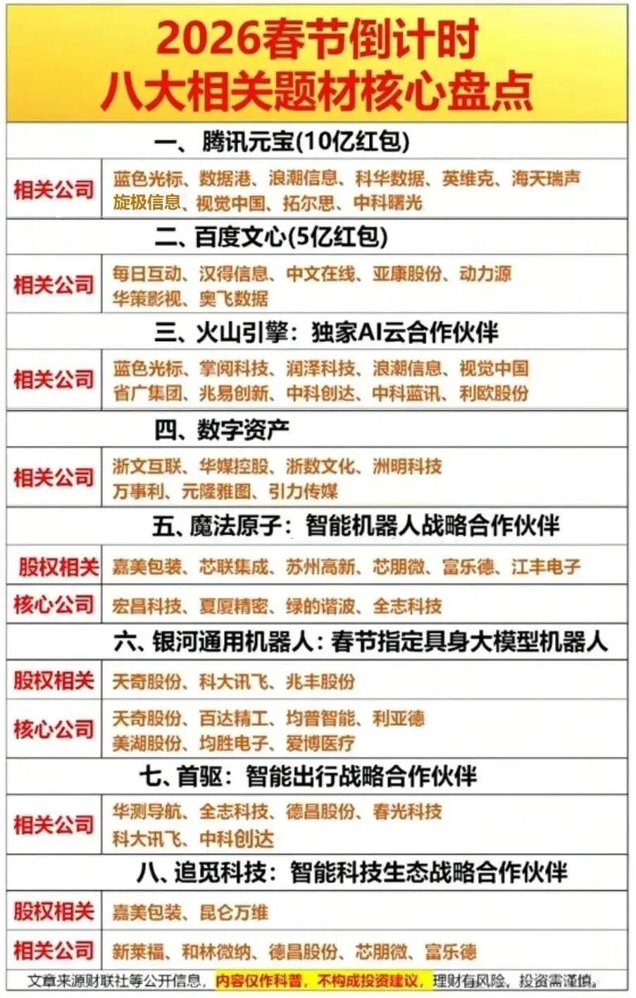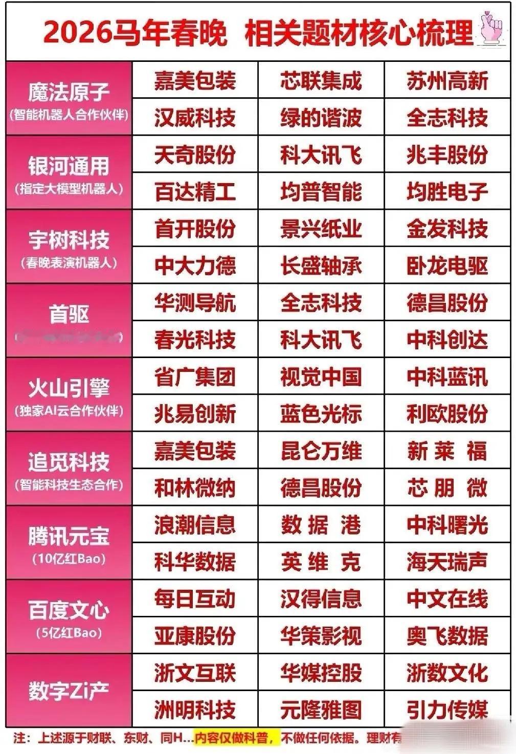 2026年春节主题概念股一、食品饮料(最稳)- 白酒(礼赠+聚餐):贵州茅台、五粮液、山西汾酒、泸州老窖、迎驾贡酒- 预制菜/速冻(年夜饭+囤货):安井食品、三全食品、味知香、广州酒家- 大众食品(礼盒+刚需):伊利股份、金龙鱼、海天味业、洽洽食品二、影视院线(春节档核心)- 院线:中国电影、万达电影、横店影视、博纳影业- 内容/发行:光线传媒(哪吒IP)、浙文影业、上海电影三、文旅/出行/酒店(弹性最大)- 景区/演艺:宋城演艺、九华旅游、峨眉山A、长白山(冰雪)- 酒店:首旅酒店、锦江酒店、华天酒店- 航空/机场:中国东航、南方航空、春秋航空、上海机场- 免税:中国中免(离岛+机场)、王府井、百联股份四、零售/商超(年货+消费回流)- 永辉超市、东百集团、三江购物、小商品城、红旗连锁五、AI/春晚/数字红包(科技主线)- 蓝色光标、浙文互联、省广集团、易点天下、利欧股份六、生肖/马年概念(2026马年)- 福龙马、云中马、万里马、天马科技、海马汽车七、农业/春耕(一号文件预期)- 隆平高科、登海种业、农发种业、一拖股份 ⚠️ 风险提示:以上仅为题材梳理,不构成投资建议;节前涨幅大、纯题材无业绩标的需谨慎。