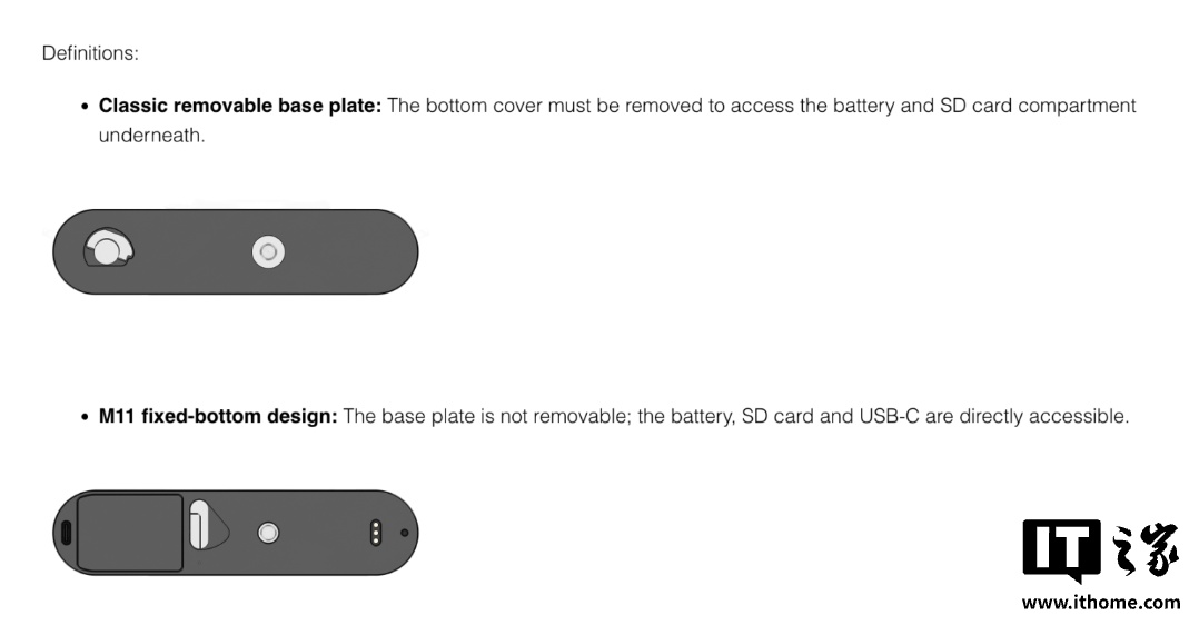 IT之家2月16日消息,徕卡M系统相机一度拥有可拆卸相机底盖(Baseplate)设计,M3-M7时代是为了便于胶卷安装。M8-M10R数码时代则是为了“致敬经典”,在拆掉底盖后用户可以自由插拔SD卡和电池。
