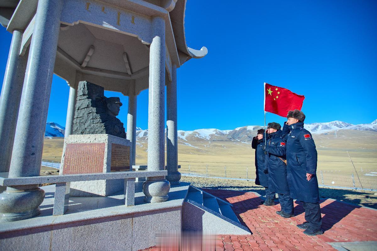 图为卡昝河边境警务站民警带着这面特殊的五星红旗向戍边烈士高继友同志致敬。