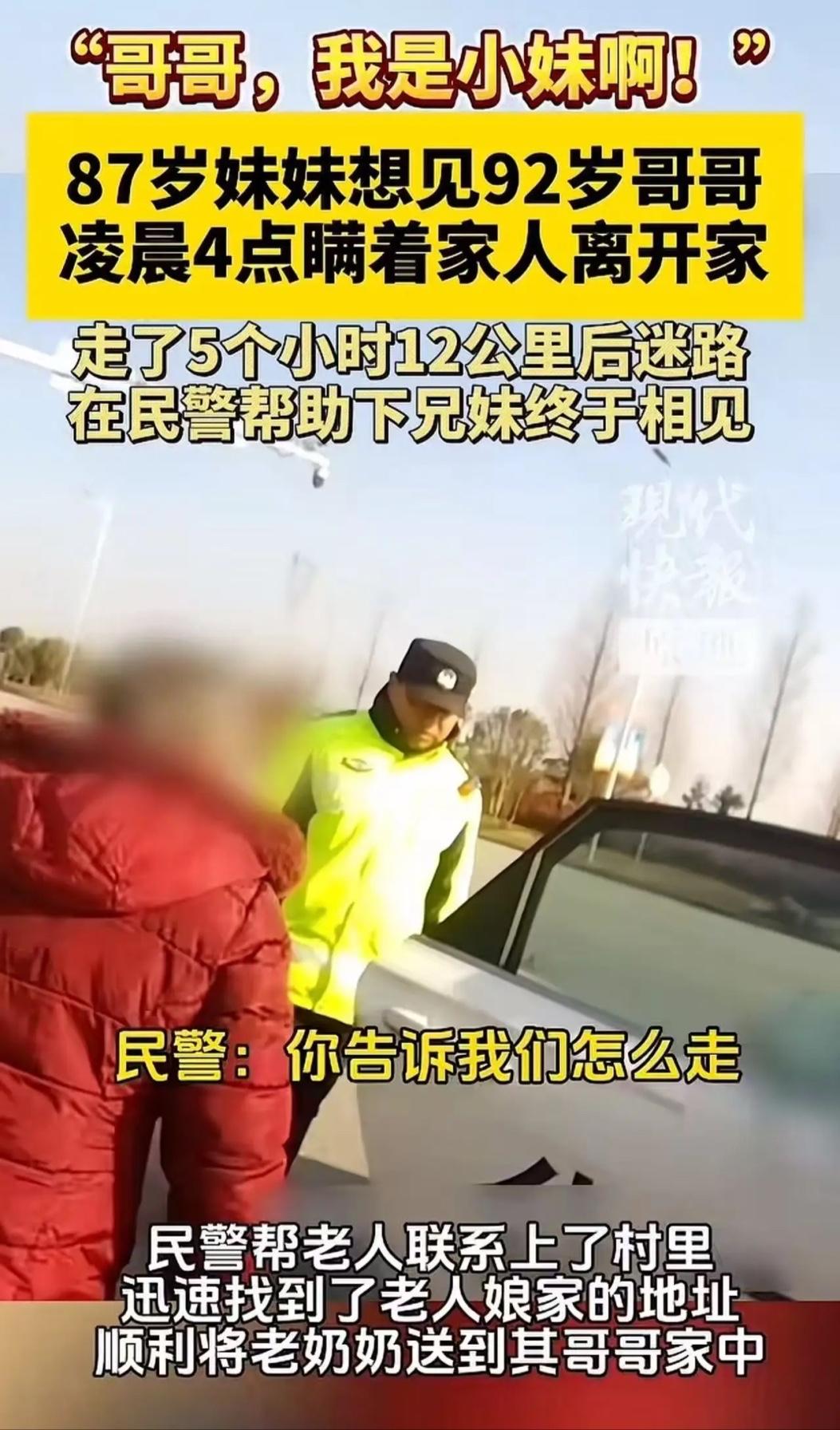 泪目!江苏,凌晨4点,87岁老人瞒着家人偷偷拄拐杖出门,只为回娘家见亲人一面,结果走了5个小时12公里后,因体力不支,瘫坐在路上。而之后发生的事情,令人泪流满面! 泪目!87岁老人的12公里寻亲路,温暖了整个寒冬 凌晨4点,当整个世界还在沉睡,江苏盐城东台镇苏何村的一户人家中,87岁的曹奶奶已悄悄起身。她轻手轻脚地拿起那根磨得发亮的旧拐杖,推开家门,踏入了寒风凛冽的雨幕。这一天,她瞒着家人,只为了心中那份难以割舍的思念——回娘家,见一见多年未见的亲人。 曹奶奶的娘家,在另一个村庄,两地相距近10公里,对年轻人来说开车不过十几分钟,可对她而言,却是一条需要用尽全力才能走完的路。她满头白发,背已驼,每走一步都显得那么艰难。但脑海里不断浮现的娘家模样和母亲的身影,成了她对抗寒冷与疲惫的力量。 一路上,熟悉的乡间小路早已变了样,陌生的街道和建筑让她时而迷茫。她会停下来四处张望,努力辨认方向,眼里虽有无助,却没有丝毫退缩。从凌晨4点走到上午9点,整整5个小时,她凭着一股执念,走完了12公里。然而,体力终究耗尽,她瘫坐在344国道边的冰冷路牙上,大口喘着气。 幸运的是,巡逻的民警很快发现了这位浑身湿透、疲惫不堪的老人。民警将她搀扶到警车上,为她倒了热水取暖。在民警的耐心安抚下,曹奶奶缓缓道出了此行的目的:“我要到我妈妈家去,我想我妈妈了。”这句话,让在场的所有人都为之动容。 民警根据曹奶奶提供的零星信息,联系了相关村干部,经过一番核实,终于确认了她娘家的位置,并得知她92岁的哥哥仍在村里生活。当警车缓缓驶入金灶村,停在熟悉的院落前时,曹奶奶的眼睛亮了起来。还没下车,她就激动地喊道:“哥哥,我是小妹啊!”92岁的哥哥颤巍巍地走出屋子,见到多年未见的妹妹,惊喜交加,快步上前紧握她的手,两位老人相拥在院子里,眼眶都红了。 这场跨越岁月的寻亲之旅,温暖了寒冬,也触动了无数人的心弦。泪目!江苏,凌晨四点 87老人只为见亲人一面