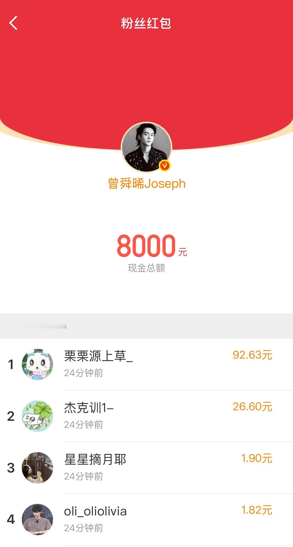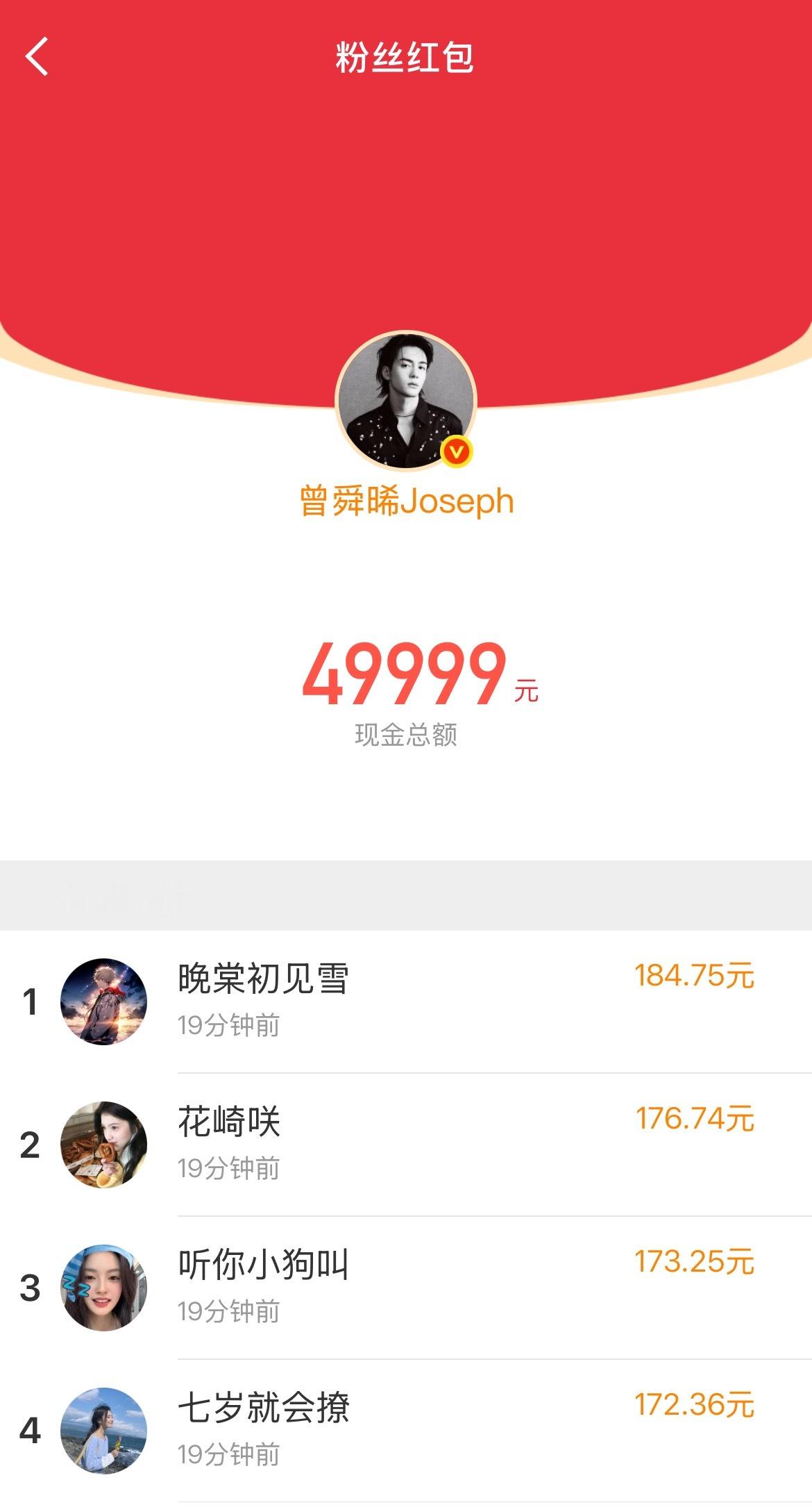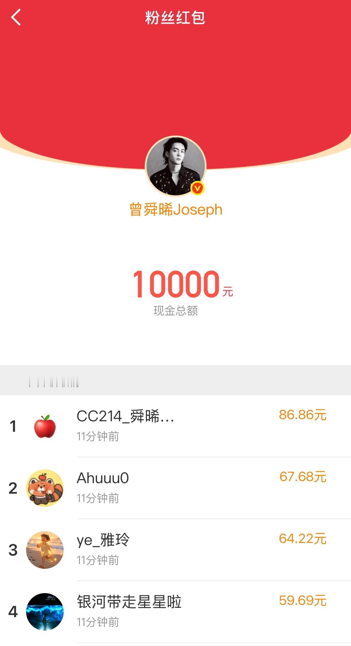 曾舜晞一共发了5个红包加在一起快88000钻粉人均200曾舜晞钻粉人均200红包