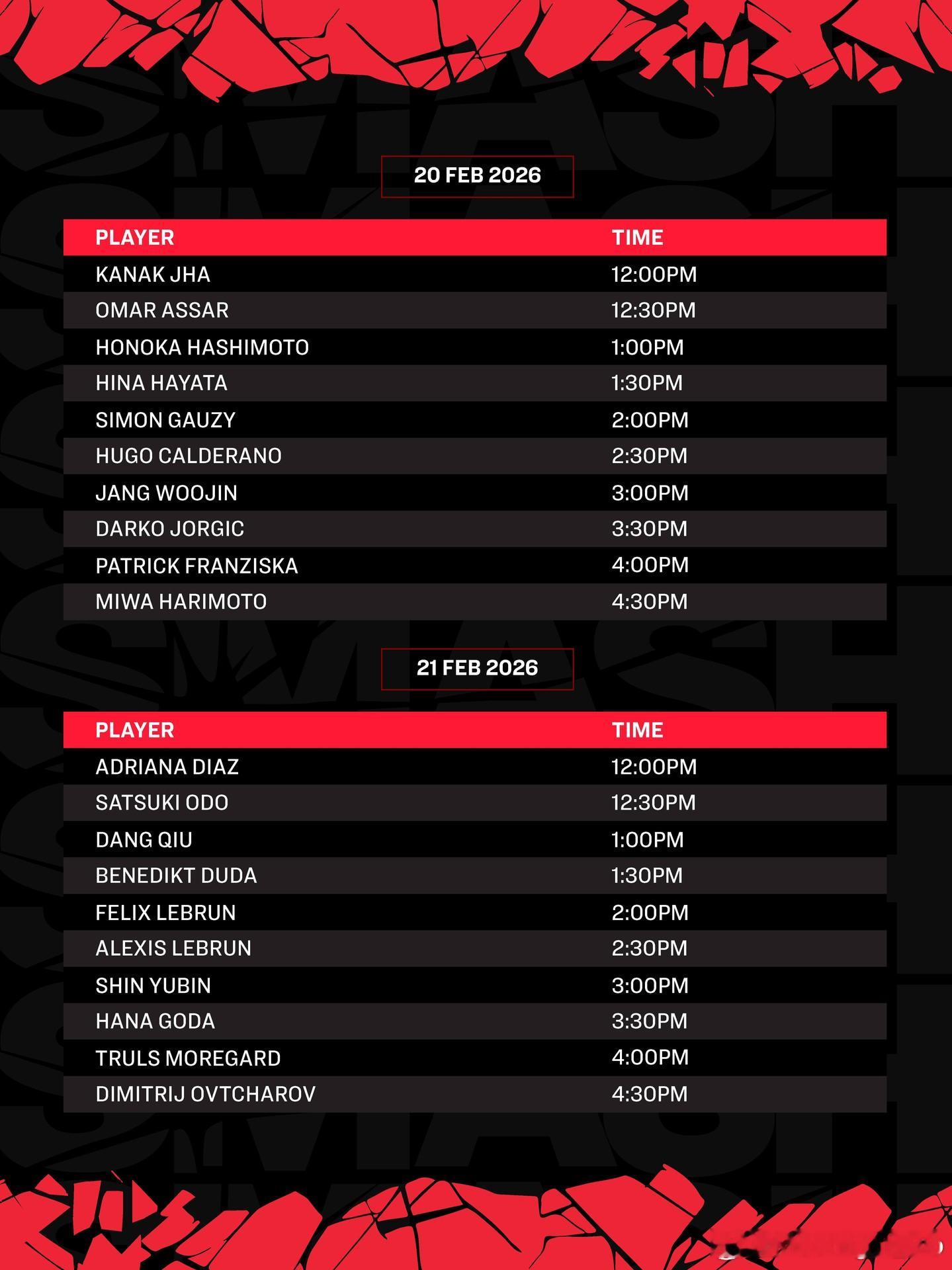 2026年2月20日• 12:00 卡纳克·贾哈 🇺🇸• 12:30 奥马尔·阿萨尔 🇪🇬• 13:00 桥本帆乃香 🇯🇵• 13:30 早田希娜 🇯🇵• 14:00 西蒙·高茨 🇫🇷• 14:30 雨果·卡尔德拉诺 🇧🇷• 15:00 张禹珍 🇰🇷• 15:30 达科·约奇克 🇸🇮• 16:00 帕特里克·弗朗西斯卡 🇩🇪• 16:30 张本美和 🇯🇵