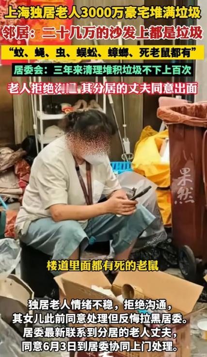 上海,一大妈花3600万,买了157平,单价23万一平的顶 流豪宅,然后,她在房子里堆满垃圾,20多万的意大利进口沙发,都用来放垃圾,屋子里蚊子,苍蝇,蟑螂,死老鼠到处都是,门外的公共电梯间也被她搞成垃圾场,让整栋楼都充斥着腥臭味,3年来,居委会清理垃圾100多次,警方,城管,居委会介入,都拿她没办法。很多业主被迫卖房搬家,她女儿的反应,更是让人匪夷所思,难道就没人管的了她了吗?结局出乎意料。 这套房位于小区最顶层,视野极佳、采光充足,配备的是意大利进口家具、智能家电,装修花费不菲。自从大妈搬进去后,邻居们就渐渐察觉到不对劲。 起初,只是从她家门缝里散发出阵阵异味,楼道里偶尔出现几只苍蝇。 可几个月后,情况迅速恶化——臭味愈发浓烈,成群的苍蝇、蚊子、蟑螂开始在公共区域肆意飞舞。甚至有居民在乘坐电梯时发现电梯地面上有老鼠尸体,吓得当场尖叫。 有人试着去敲她家的门,却被大妈怒气冲冲地赶走:“别管我家事!我乐意!” 邻居后来才知道,大妈在屋里不仅囤满垃圾,连价值20多万的意大利进口真皮沙发,也成了垃圾堆放台,塑料袋、废纸箱、发霉的食物包装塞得满满当当。 卧室、阳台、厨房、卫生间无一例外地被垃圾占据,臭气熏天。 更糟糕的是,大妈不光把自家变成“垃圾场”,连门外的电梯间也成了她的“领地”。她把用完的塑料袋、过期食品、旧衣物一股脑丢在公共区域,导致整层楼的空气里弥漫着腥臭与腐败的气味。 “我们花几千万买的房子,每天都像住在垃圾堆上面。”一名住户无奈地对记者说。三年来,业主们不断投诉,物业也多次上门协调,可每次都被大妈拒之门外,甚至被骂得狗血淋头。 居委会、街道办、物业公司、城管、警方都先后介入。居委工作人员说,他们三年间至少组织清理超过100次,每次都是满满几车垃圾,从她家运出一车又一车,但几天后,屋子又重新堆满。 “她有严重的囤积癖。”一名参与过清理的工作人员说,“你清理她的东西,她就跟你急,甚至会用身体挡门,不让进。” 由于恶臭和害虫问题不断恶化,小区不少业主无奈搬走。有人实在受不了,直接低价卖房离开。 更令人不解的是,这位大妈并非孤寡老人。居委调查发现,她其实有丈夫和女儿,只不过两人都没有与她同住。 “她女儿其实就在上海,也有稳定的工作。”一位居委干部透露,“我们一开始以为是老人孤独导致心理问题,所以联系她女儿,希望她能出面劝说母亲配合清理。” 起初,女儿态度良好,答应协助居委上门清理,还表示愿意帮母亲做心理疏导。可没想到,没过几天,她突然反悔,甚至将居委工作人员全部拉黑,再也不接电话。 女儿的反常举动,让事情陷入僵局。有人猜测,她与母亲关系紧张,也有人怀疑她怕承担法律或经济责任。 眼看清理工作陷入困境,居委又辗转联系到了大妈分居多年的丈夫。出乎意料的是,丈夫的态度相对平和。 “她以前不是这样的。”丈夫叹气道,“年轻时她勤俭节约,家里一尘不染。后来退休后变得孤僻,总觉得东西扔了可惜,慢慢就控制不住了。” 在多方沟通下,丈夫终于同意配合居委一起上门处理。居委决定把6月3日定为集中清理日,计划联合社区民警、心理医生、物业及环卫人员共同进入清理。 “我们希望这次能彻底一点。”居委工作人员说,“但也担心她临时反悔,或者家属再一次退出。” 这起“豪宅垃圾屋”事件在网络上引发广泛讨论。有人愤怒,觉得她污染环境、扰民严重;也有人感叹,一个能买得起3600万豪宅的人,却陷入心理的孤岛,实在让人唏嘘。 如今,居委和街道仍在持续跟进。居民们也在焦急等待6月3日的那一天,希望这场困扰了整栋楼三年的噩梦,终于能够结束。 然而,没有人能确定——这一次,大妈是否真的会打开那扇被臭气封锁已久的门。