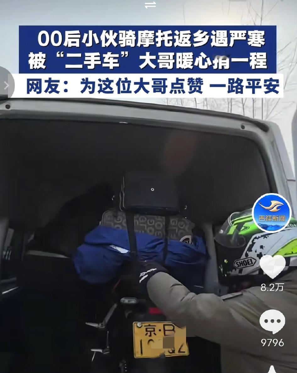 破防了!零下严寒千里返乡,00后小伙骑摩托被冻到浑身僵硬,二手车大哥一句“我带你一段”,网友:为这位大哥点赞,一路平安! 2026年春节前,00后小伙揣着一腔热血,做了一个大胆又真诚的决定——骑摩托车从北京回吉林长春。 他不是为了耍帅,不是为了打卡,只是想骑着自己最爱的摩托,平安出现在家门口,给同样热爱摩托的父亲,一个最实在的新年惊喜。 可一进入东北地界,他才真正明白,什么叫寒冬刺骨。 越往北走,气温越低,风像带着冰碴,一刀一刀往脸上、往脖子里灌。头盔挡不住寒气,手套没多久就冻得邦邦硬,手指弯都弯不回来。 腿是麻的,脚是木的,肩膀僵得发酸,每拧一下油门,都像在跟冰冷的天气死扛。 呼出的气在头盔里瞬间变凉,鼻腔里都是刺骨的冷,他咬着牙硬撑,心里只有一个念头:再坚持一下,快到家了。 从沈阳新民往吉林四平的那段路,是最难熬的一段。 天灰蒙蒙的,风裹着寒气往骨头缝里钻,他浑身冻得发僵,视线都有些发直,连说话的力气都快被冻没了,只靠着一股执念往前骑。 就在这时,身后一辆车慢慢靠近,缓缓停在他身边。 车窗摇下,一个热心的大哥探出头,第一句话就带着心疼: “冷不?冷不?!” 小伙冻得嘴唇发紫,牙齿都在打颤,只能挤出一个字: “冷……” 得知他是从北京一路骑摩托回长春,大哥当场又意外又心疼。 小伙冻得实在扛不住,老实地说:“没寻思……能这么冷。” 大哥看他冻得浑身僵硬,二话不说,当场开口: “我正好上四平,带你一轱辘,把车装上行不行?” 就这一句话,在零下的寒风里,瞬间砸进小伙心里,暖得他眼眶一热。 一路冻到麻木的心,突然就被这一句陌生人的善意,彻底捂热了。 大哥二话不说,下车帮忙抬车、固定、绑紧,动作麻利又实在,没有半点犹豫。 小伙坐在温暖的车里,看着窗外呼啸而过的寒风,那一刻,心里又酸又暖,差点说不出话。 这一路,大哥捎了他整整一大段,让他少挨了数不清的冻,少受了无数的罪。 分别时,大哥还不忘反复叮嘱: “路上一定注意安全,赶紧回家,家里人都等着呢。” 没有多余的客套,没有功利的算计,只是一个陌生人,对另一个归乡人的真心牵挂。 风雪再冷,抵不过人心一暖。 最平凡的善意,最动人。 返乡路上的温暖 00后骑行千里回家 陌生人的善意最破防 春节最暖瞬间 东北人都是活雷锋 寒冬里的暖心一幕 平凡英雄 来源:吉祥新闻 及网络公开内容,如有侵权请联系即删 配图说明:本文配图/视频素材来自@ 吉祥新闻 ,仅用于内容分享,侵权联删