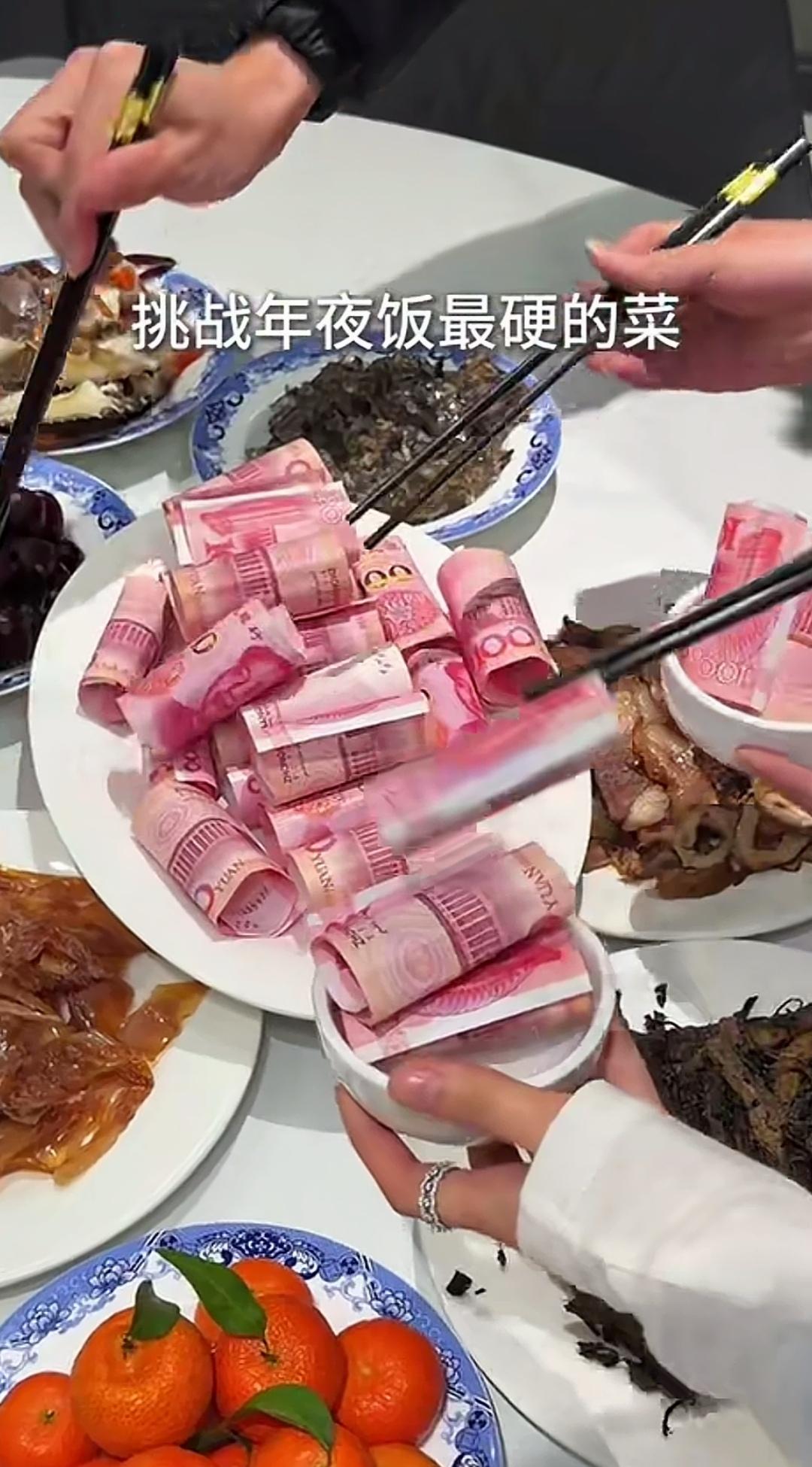 年夜饭上,这道菜刚一端上桌,众人的筷子便纷纷伸了过来,这道“硬菜”可真是抢手啊! 瞧瞧画面里的这道菜,乍一看好似打火锅用的薄牛肉片,可定睛一瞧,竟全是用红钞卷成的,这道菜也太“硬”了吧! 春节年夜饭菜单