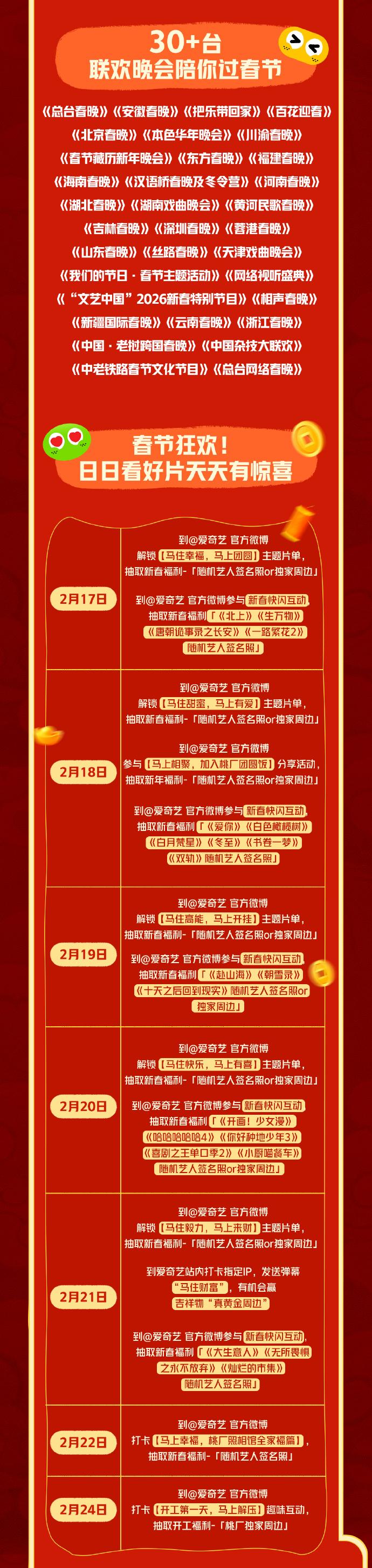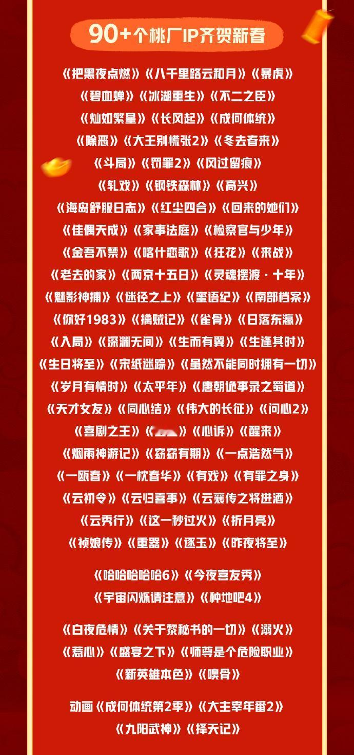 [666]我宣布年度最顶的春节档来了! 🥝放出超超超长春节预告,有白鹿、敖瑞鹏、李昀锐、邓为、迪丽热巴、成毅、鹿晗、杨紫、张凌赫、鞠婧祎、田曦薇、王鹤棣、刘耀文、谭松韵、魏大勋、龚俊、黄景瑜等170+个艺人的拜年祝福,还有《冰湖重生》《不二之臣》《这一秒过火》《灿如繁星》《来战》《两京十五日》《南部档案》《哈哈哈哈哈6》《种地吧4》《虽然不能同时拥有一切》《云初令》《祯娘传》……90+IP上线贺岁,30+联欢晚会轮番炸场!我说这个马年就按这个节奏给我马不停蹄的一直发新物料好吗