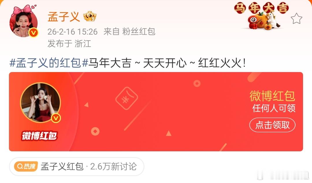 孟子义 先发美图再发红包又美又大方的孟子义发红包了🧧先发美图再发红包,哈哈哈孟姐可真是天才春节刷到宝了马年大吉