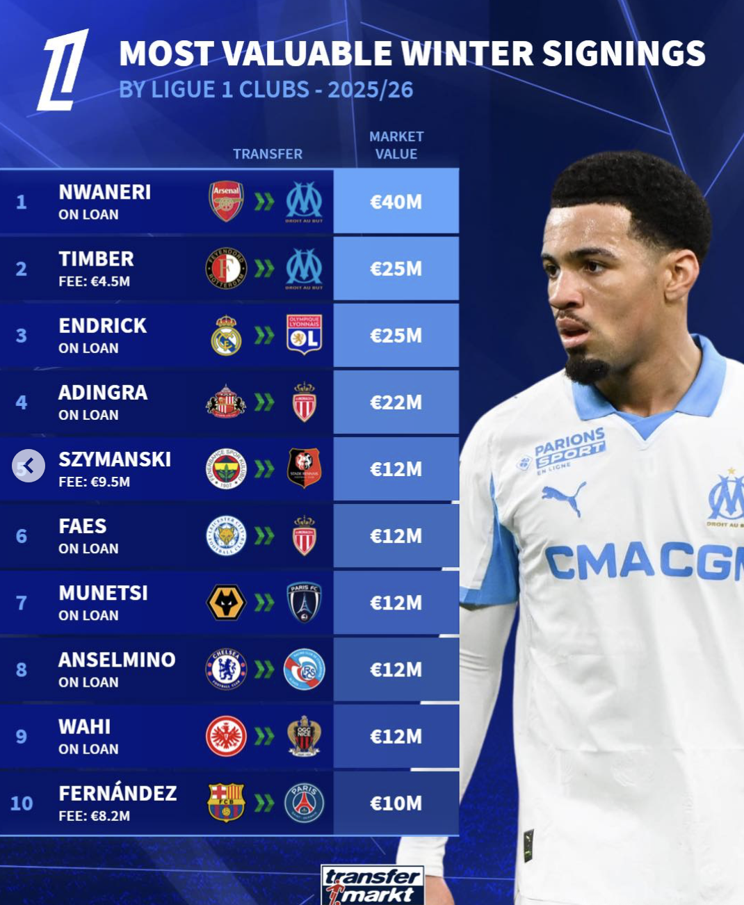 马赛引进的恩瓦内里和大廷贝尔分别以4000万和2500万的身价排名前二;里昂引进的恩德里克以2500万的身价排名第三。