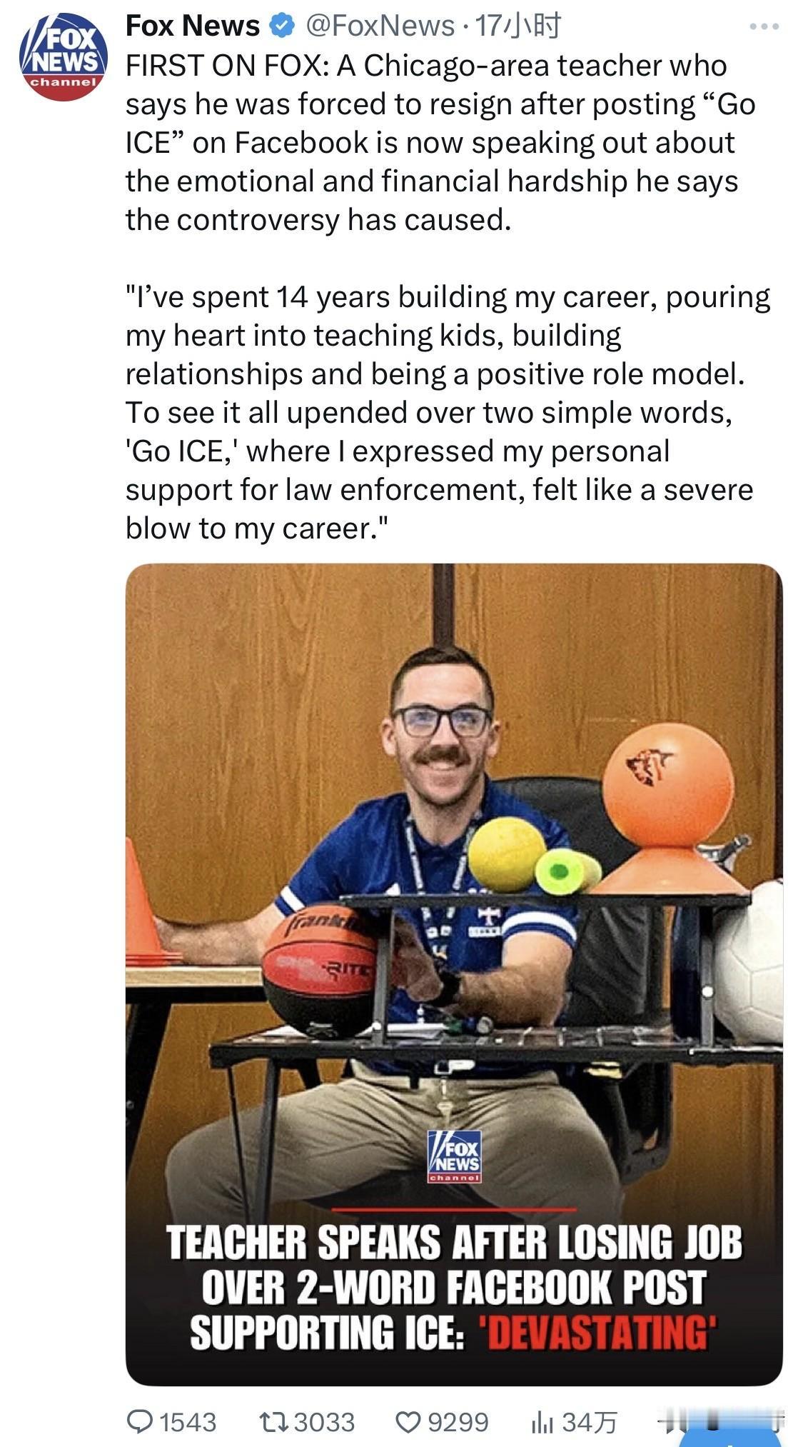 福克斯新闻首发:一名芝加哥地区的教师称,他在 Facebook 上发布“Go I