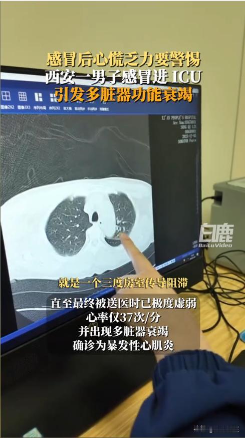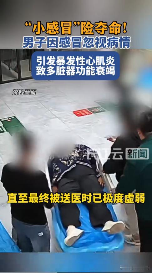 “太吓人了!”近日,陕西西安,一男子突然鼻塞咽痛、恶心呕吐,以为是普通小感冒,便硬扛着照常上班熬夜。没想到第三天凌晨,他突然胸闷如石压、心慌喘不上气,家人紧急送医后才发现,这“小感冒”竟引发了暴发性心肌炎,多脏器功能衰竭,险些丧命! 很多人觉得感冒是小毛病,扛一扛就过去了,但实际上,病毒感染可能引发严重的并发症,尤其在身体过度劳累时,风险更是成倍增加。 据媒体1月30日报道,前不久,男子开始肌肉酸痛、恶心呕吐,甚至发起低烧,以为是小感冒,就自己找了些药吃,也没当回事,照常加班上班、熬夜赶工。到了第三天凌晨,他突然被胸口的剧痛惊醒,胸闷得像被巨石压住,心慌得厉害,浑身冷汗直流,连说话都断断续续,起身时双腿发软直接瘫倒在地。 家人见状吓得魂飞魄散,紧急拨打120将他送往医院。到达医院时,男子已经身体极度虚弱,陷入了昏厥。检查结果显示,他患上了暴发性心肌炎,病毒已全面侵袭心肌,导致心脏扩大、心功能急剧下降,同时引发肝、肾等多脏器功能衰竭,生命体征一度濒临消失。 经过十几天的紧急抢救和重症监护、呼吸机的支持,男子才勉强脱离生命危险。医生提醒,感冒后如果出现胸闷、心慌、呼吸困难、持续低烧不退等症状,务必立即就医,切勿硬扛或过度劳累。 信息来源:《男子感冒竟引发暴发性心肌炎致多脏器功能衰竭》长江云新闻