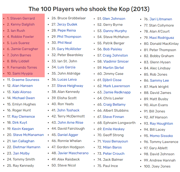 早在20年前,俱乐部就曾发起球迷投票,评选出《震撼 Kop 的100位球员》;2013年又推出了第二版评选。