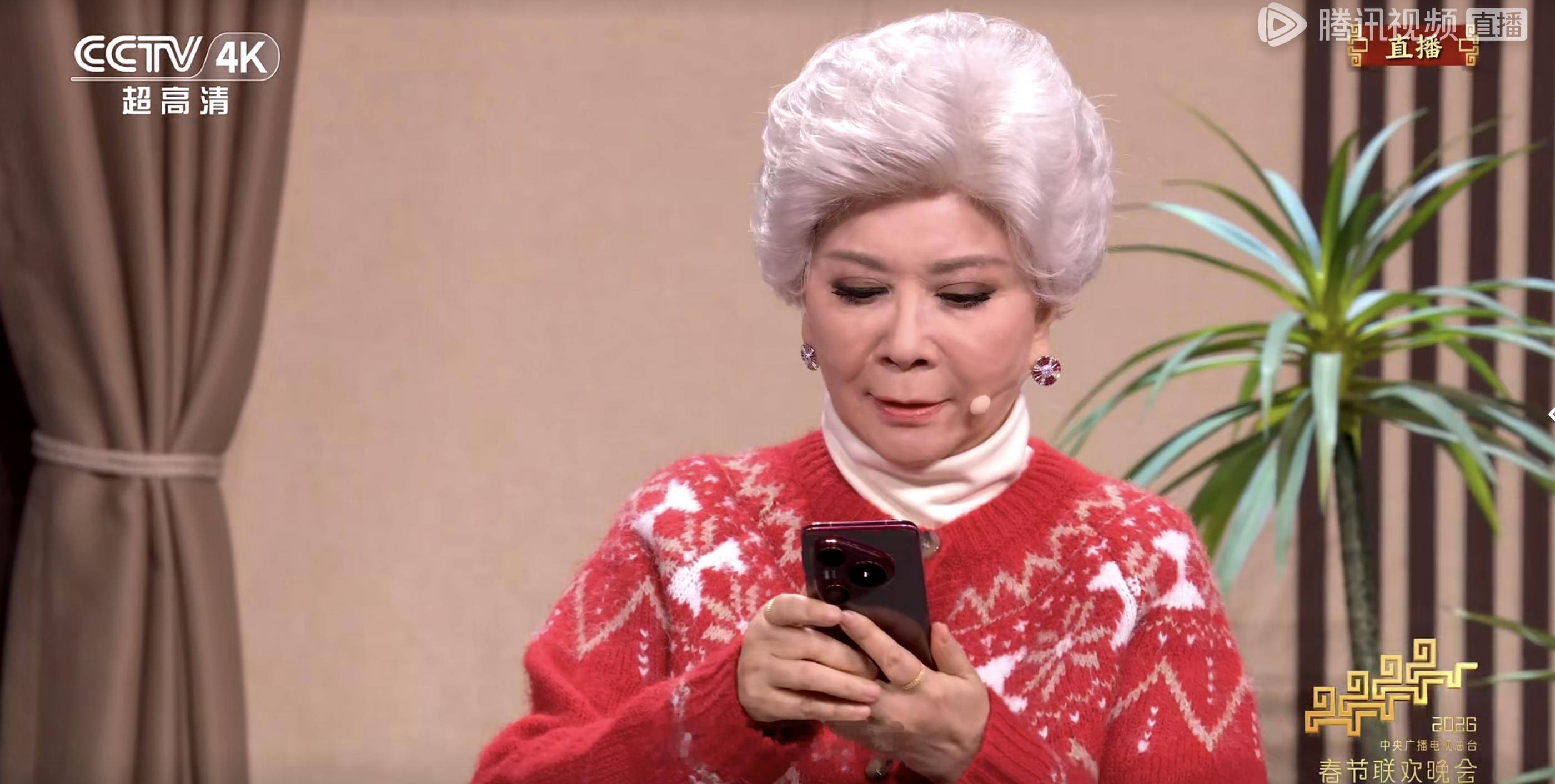 春晚 蔡明好久不见另外机圈职业病,一眼看到天放手上拿着华为三折叠、蔡明手上是华为