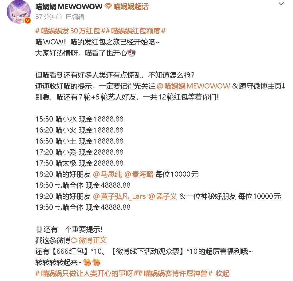 喵娲娲红包额度谢谢喵小水 18888.88×3已发完,的喵喵们还在排队!N只没登