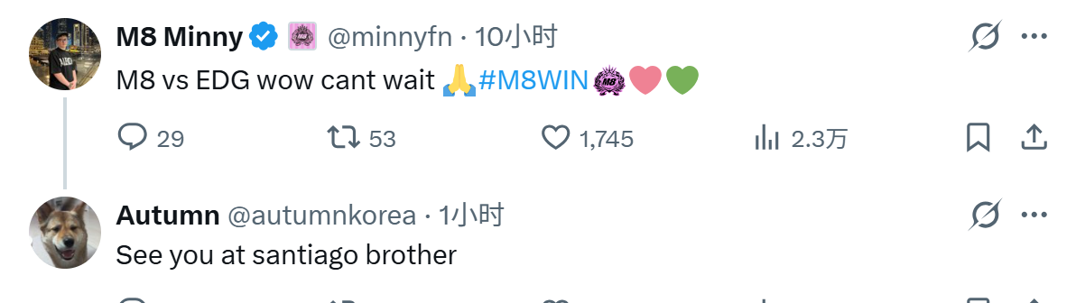 虎扑02月16日讯2026圣地亚哥大师赛瑞士轮首轮抽签结果为EDGvsM8,对此M8选手Minny发文: