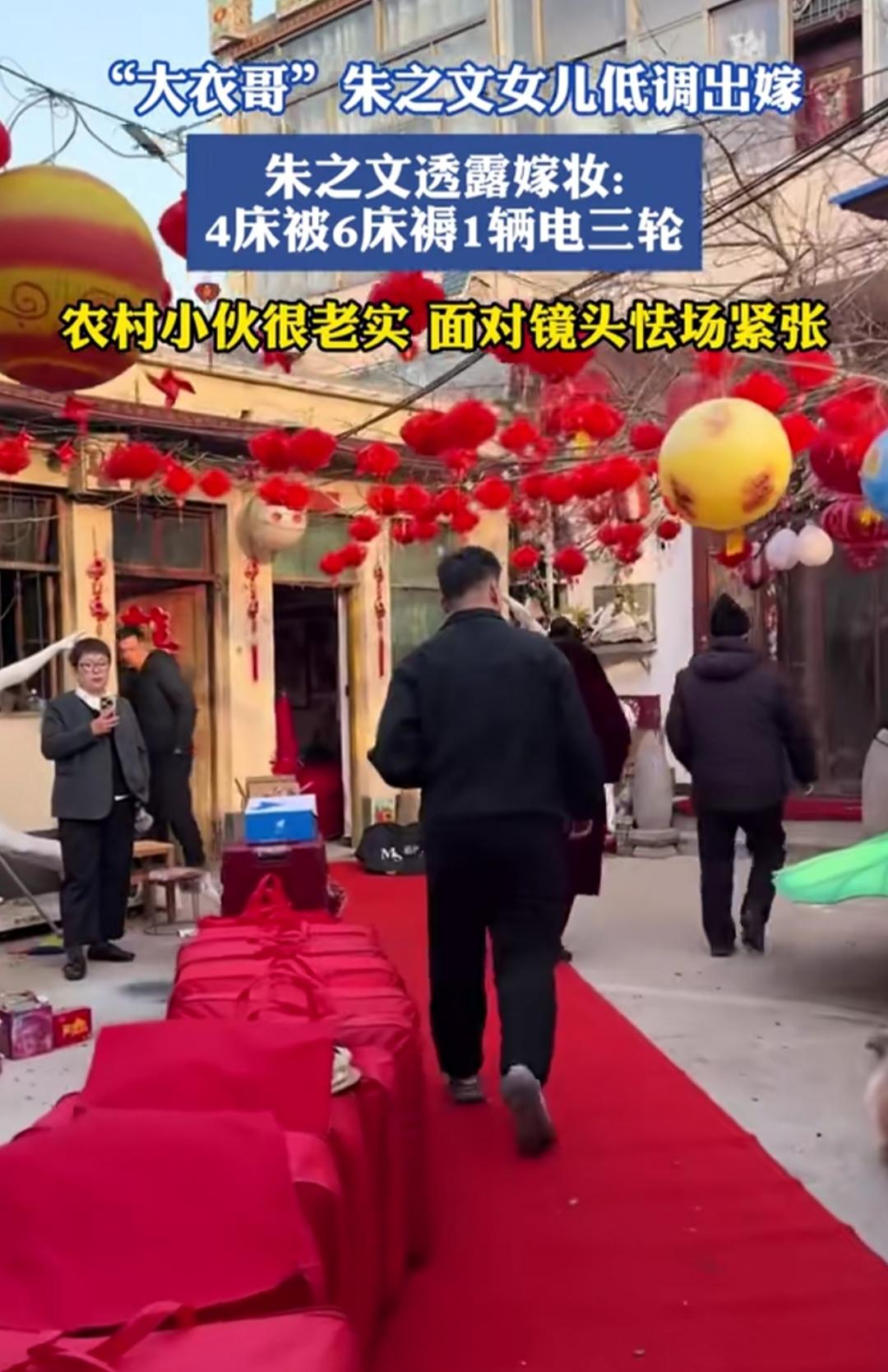 谁能想到大衣哥女儿出嫁,嫁妆居然先曝了4床被6床褥1辆电三轮,这朴实的配置一出,瞬间让人愣了下,毕竟总被传身家不菲的大衣哥,嫁女儿的初版嫁妆也太接地气了,妥妥的农村嫁女标配,一下子就拉满了生活感。 后来才知道,这只是冰山一角,实际陪嫁藏着不少实在的心意,单县县城120平全款精装房、25万左右的家用SUV,还有创业启动资金,没有天价噱头,全是能让女儿婚后过得安稳的实用保障,谣言里的500万陪嫁也不攻自破。 婚礼也是在老家朱楼村办的,腊月廿六的农村婚礼,布置简单又喜庆,新郎还是邻村的普通小伙,家境平凡但人踏实。大衣哥择婿不看家境重人品,嫁女不求排场求实在,这份藏在烟火气里的爱,比任何天价嫁妆都戳心。