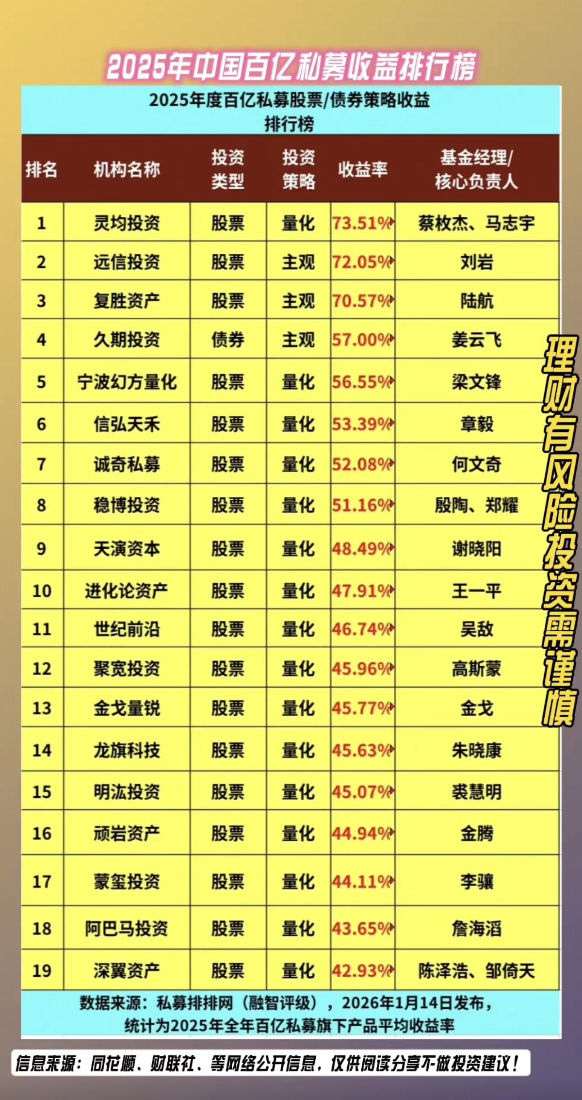 2025年中国百亿私募收益排行榜新鲜出炉,灵均投资一骑绝尘领跑!据私募排排网统计