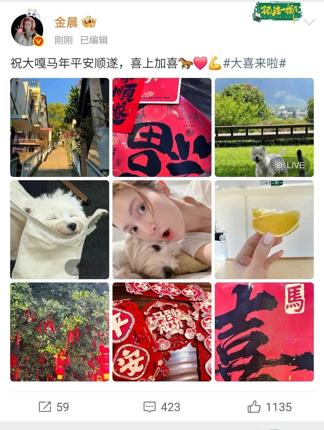 女明星金晨发文祝福大家马年快乐。