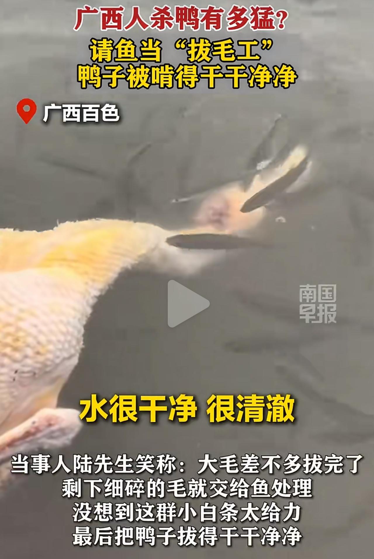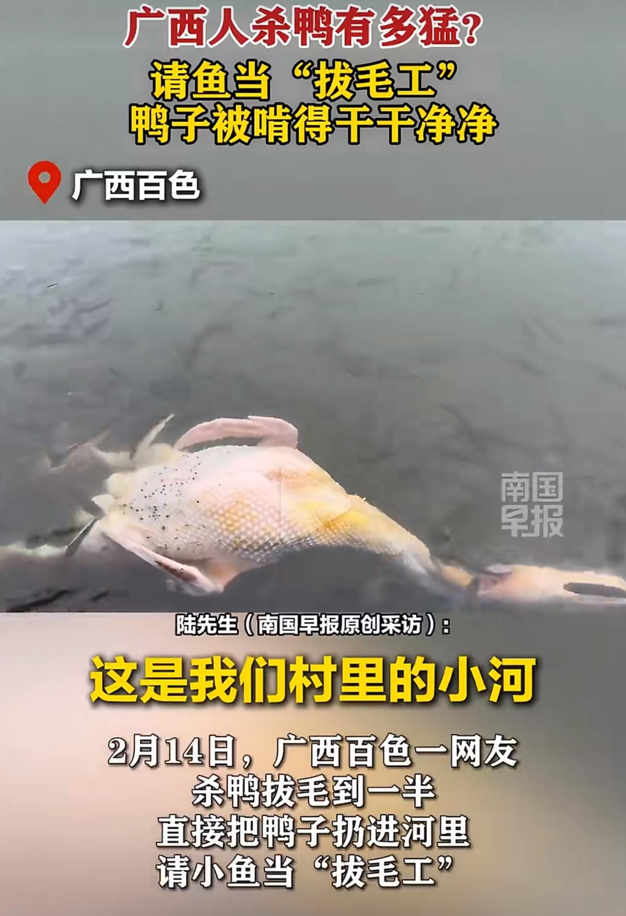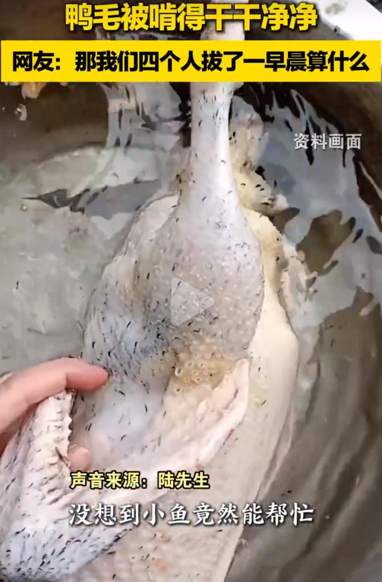 2月14日,百色的陆大哥拔鸭毛拔到手指发僵,看着剩下的细绒毛犯了愁。灵机一动,他把拔完粗毛的鸭子往村边小河里一放,没想到奇迹真的发生了。 成群的小白条鱼瞬间围上来,对着鸭皮一阵“啄食”。等陆大哥把鸭子捞上来一看,那些最难拔的细绒毛全都没了,干干净净的,看着都让人觉得神奇。他随手拍了个视频发到网上,一下子就火了。 网友们在评论区直接笑疯了,有人说这些小鱼是免费临时工,还有人开玩笑说,拔完毛直接把鱼捞起来当下酒菜。大家也想起之前广西“鸡帮鸭拔毛”的趣事,忍不住感慨:广西的动物,过年也是要“打工”的。 这法子看着野,实则是实打实的乡土智慧。鱼啄的是皮屑,顺带把毛带下来,和鱼疗一个道理,既省劲又环保。 不过也得提个醒,这招全靠水质好。城里的河道或者脏水可千万别试,别把好事办砸了。 不得不服,高手真的在民间,生活里的智慧太绝了!鸭毛拔除 鸭拔毛 民间智慧