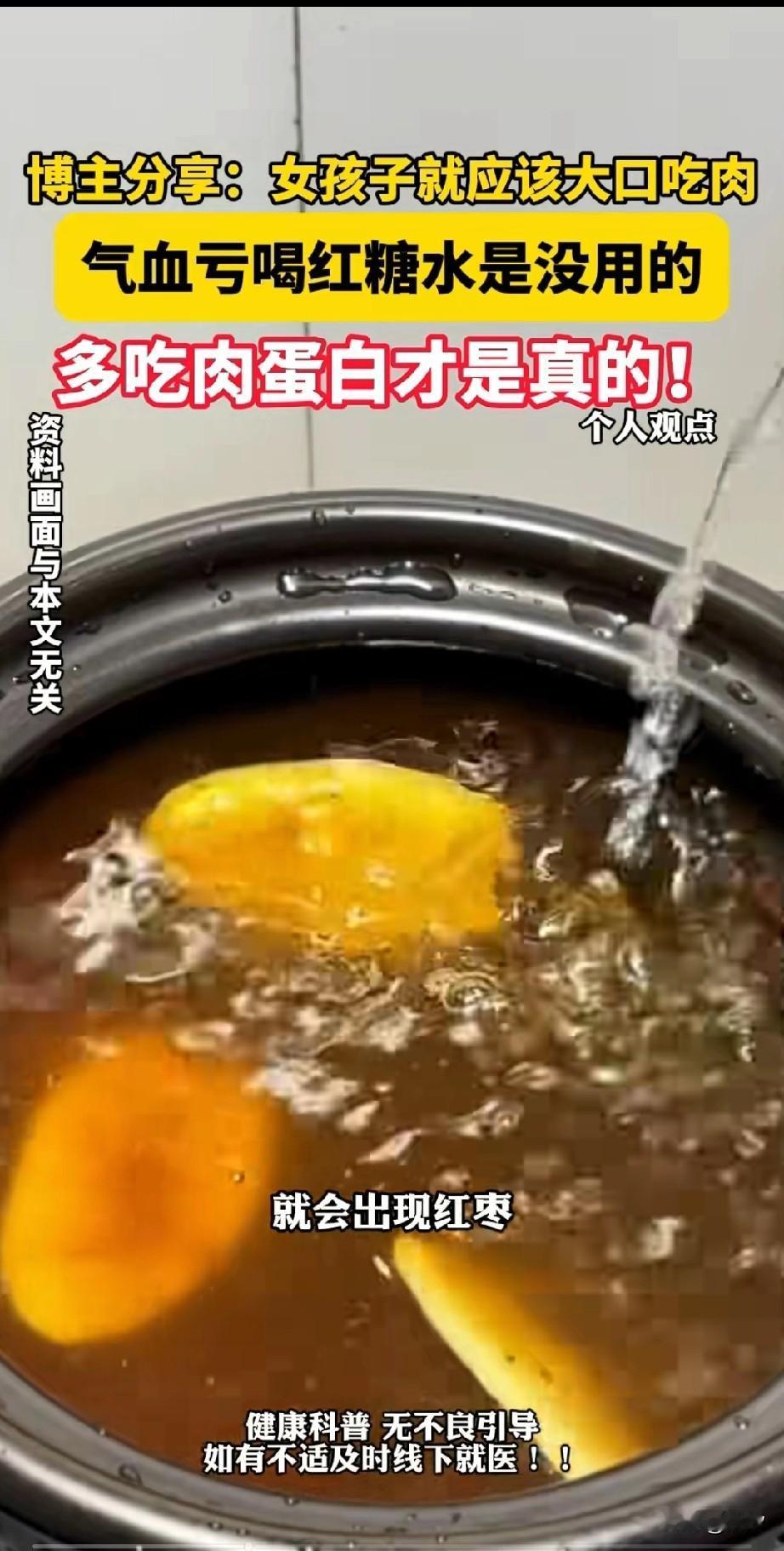 女博主分享了女生大姨妈来的时候, 就不应该喝红糖水, 或者大枣,姜片煮水, 这些都不能补充蛋白质, 为了缓解痛经的感觉, 就应该大口的吃肉, 她说气血亏喝红糖水根本没用, 因为里面的含铁分量几乎没有, 女人那个时候最应该补充蛋白质, 吃牛肉这些东西是最快补充蛋白质的, 这样才能尽快的补充体力, 大家觉得这名美女博主分享的对吗? 姜茶好处 对大姨妈好一点 暖宫姨妈汤 补气血姨妈特饮