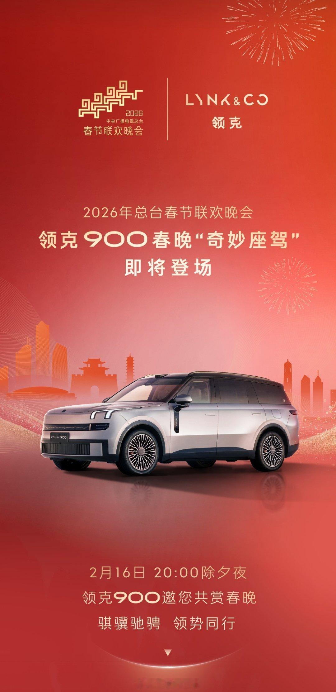 春晚奇妙座驾领克900领克排面啊!领克900登央视春晚,诠释中国智造新高度!2026年央视春晚义务分会场,吉利领克900获评官方指定“奇妙座驾”,亮相国民顶级舞台。以“一个吉利·伴爱同行”为内核,领克900不仅是集团高端化、智能化的标杆之作,更承载着“中国智造”的硬核实力。吉利以全域资源聚力新质生产力,深耕AI科技,坚守“造每个人的智能精品车”初心,将吉祥寓意与科技创新深度融合。此次登陆春晚,是“一个吉利”战略的生动落地,更是中国汽车向世界展示自信与引领力的高光时刻。新年开上900全家都说行