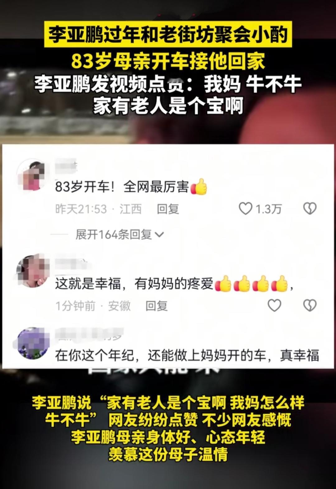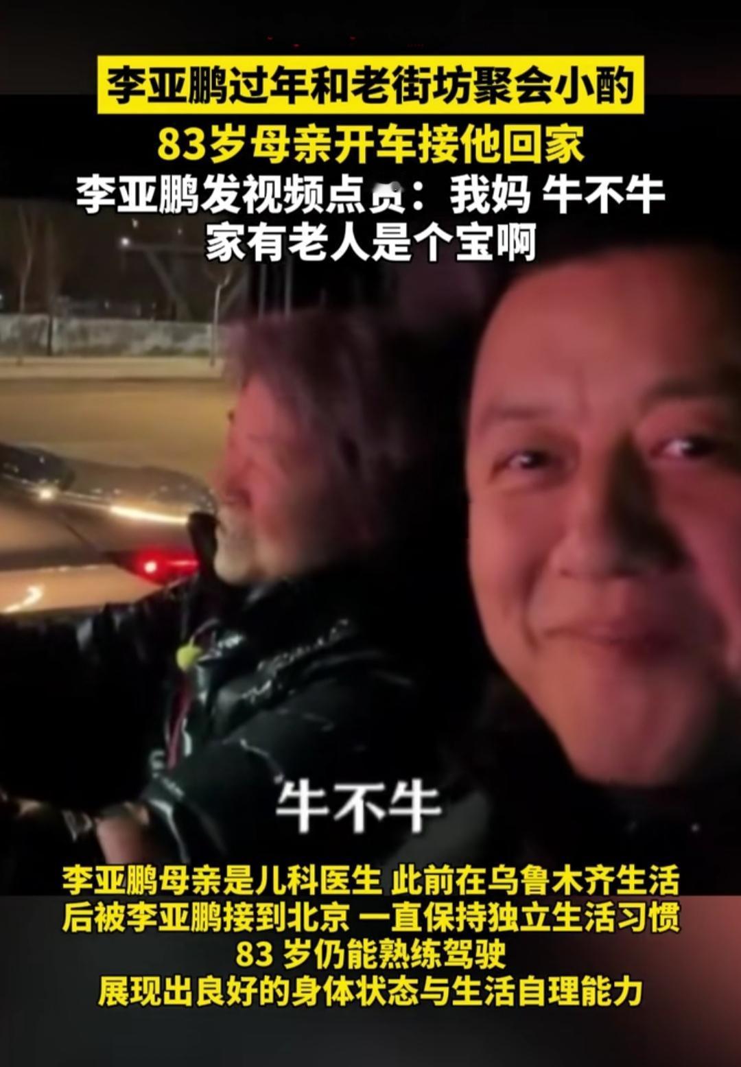 谁能想到年过半百的李亚鹏,春节还有超暖心的专属接送!2月15日他和老街坊小酌后,竟是83岁老母亲开车来接,他发视频感慨“我妈,牛不牛,家有老人是个宝啊”,一句话戳中无数人内心。 虽然李亚鹏的妈妈已是耄耋之年,却精神矍铄,开车操作十分稳健,而且老人持有合法驾驶证,完全符合高龄驾驶的相关规定,全程合规上路。 也有人说有些羡慕李亚鹏一把年纪还能被妈妈宠着,虽是简单的日常,却藏着最真切的亲情。或许真如李亚鹏所说:家有老人是个宝啊!
