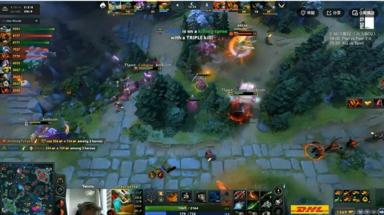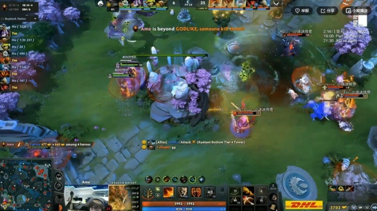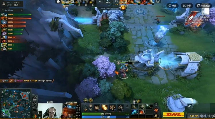 [22分钟]XG下路动手,配合NTS火猫切后排再次强杀掉了Collapse人马+rue松鼠!这波0换2打完XG成功拿下一代肉山,Ame龙骑士带盾,想做坏事的panto发条还被Fy毒狗一个关找到了!不过回头Spirit四人在中路借助Yatoro飞机大炮输出秒掉了NTS火猫+xNova百戏大王,瞬间打回2K经济差啊!