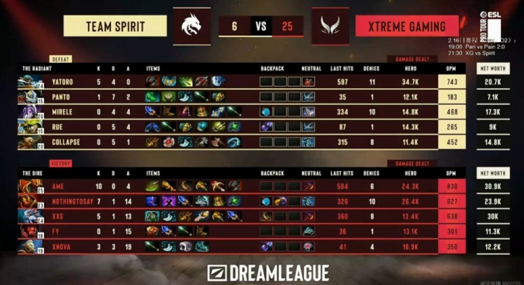 首局比赛双方平稳发育,7分钟XG线杀Yatoro飞机拿到一血!中期XG掌握局势主动,Spirit则是连续让Yatoro飞机发育想憋后期!XG连续gank+团战强杀Collapse人马,Fy毒狗则是关留人+连续两次团战保住了被集火的NTS火猫没让他被强杀!XG一波上路经验符团战+中路团让Collapse人马买活死之后控下二代盾拉开经济差!Mirele紫猫毫无存在感啊!最终XG拆完三路高地,秒掉Yatoro飞机先拿一分!