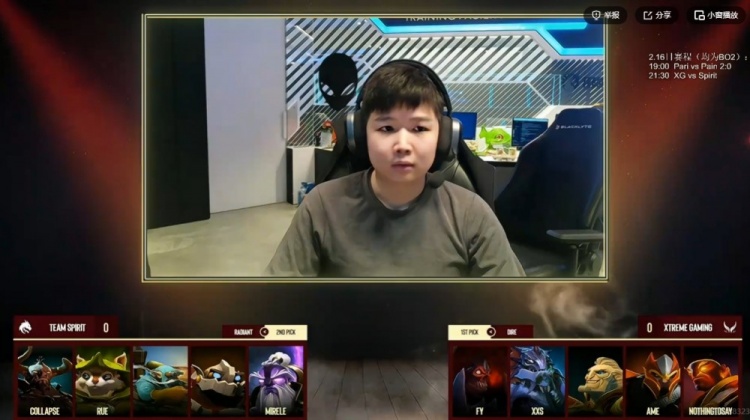 天辉Spirit:Collapse半人马、rue森海飞霞、Yatoro矮人直升机、panto发条技师、Mirele虚无之灵