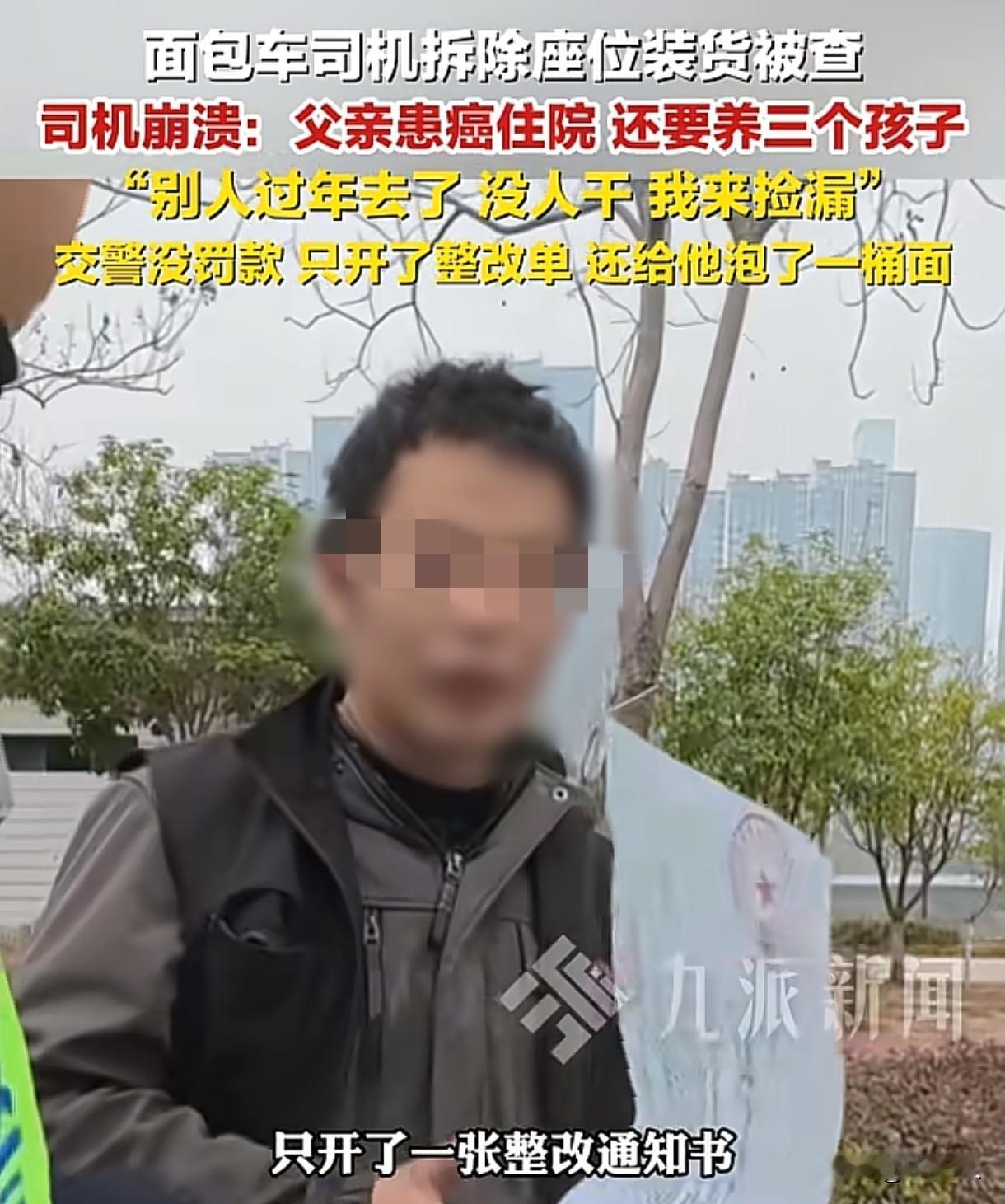 “这就是执法的温度!”湖南长沙,男子将面包车座椅全部拆除,用来拉货,被查获后,男子承认自己改装了车辆,但是他也说出了自己的苦衷:父亲患癌住院,等着用钱,自己还有3个子女要抚养,大过年的,别人都回家过年了,自己出来捡点漏,多挣点钱用来负担父亲的医疗费和家庭开支。交警没有急着罚款,而是明确告知司机非法改装的安全隐患和相关法规,得知男子没有吃午饭,还给男子准备了泡面和水,他接下来一句话,让男子湿了眼眶。 车水马龙的街头,执勤交警像往常一样,在道路上进行日常检查,眼神专注地留意着每一辆过往车辆。 这时,一辆面包车引起了他的注意,凭着职业的敏锐,他觉得这辆车有些异样,便果断将其拦下。 他走到车旁,仔细核查后发现,这辆面包车的座椅竟被全部拆除,车厢里堆满了各种各样的货物,有纸箱、塑料桶,还有一些杂七杂八的生活用品。 他示意驾驶人下车,开始询问情况,驾驶人是一位中年男子,面容憔悴,眼神中透着疲惫和无奈。 司机低着头,声音有些颤抖地承认了自己改装车辆和违规载货的事实,还轻声说:我知道不对,但是为了生活。 司机说出了自己的苦衷,自己家里有3个孩子需要抚养,开销本来就大,不料屋漏偏逢连夜雨,自己父亲身患癌症,又急需钱来看病。 自己没什么特殊技能,只能靠开面包车拉货赚点辛苦钱,临近春节,别人都回家团圆过年了,可他却不敢休息,他想着多跑几趟,多赚点钱,哪怕能多给父亲买一瓶好药,给孩子们添一件新衣服也好。 他苦笑着说:“别人都回去过年了,哪还有活干,我就想着能多捡点漏。” 交警在了解完司机的实际困境后,并没有简单地一罚了之,他先严肃且详细地向司机说明了非法改装车辆存在的巨大安全隐患,以及相关的法律法规,让司机深刻认识到自己行为的错误性和严重性。 《道路交通安全法》第16条第1款规定:任何单位或者个人不得拼装机动车或者擅自改变机动车已登记的结构、构造或者特征。 面包车作为载客汽车,其座椅是车辆结构的重要组成部分,拆除后排座椅改变了车辆的登记状态,属于非法改装。 司机拆除面包车座椅用于装货,这属于擅自改变机动车已登记的结构,是法律明确禁止的行为。 另外,载客汽车除车身外部的行李架和内置的行李箱外,不得载货。 面包车人货混装,一旦在行驶的过程中出现急刹、加速、转弯等情况,容易引起车内货物磕碰、撞击、甚至移位、翻滚,会影响行车安全,造成人员受伤。 如被当场查获,民警可能会责令驾驶人恢复车辆原状,并处罚款。 随后,交警的语气变得温和起来,他开始劝导司机,理解他为了家庭生计而奔波的辛苦,叮嘱他在努力赚钱的同时,一定要把行车安全放在首位,毕竟安全才是回家最近的路。 接着,交警给司机出具了整改通知单,跟他说:“不罚你款,不要紧张好不好?虽然不是罚单,对你起不了一个绝对的约束作用,但是我相信你,能做好!” 这句话就像一股暖流,瞬间温暖了司机的心。 长久以来,他一直硬撑着,独自承受着生活的重重困难,此刻,他再也控制不住自己的情绪,用手捂住脸,泪水止不住地从指缝间滑落。 交警看到司机情绪激动,又注意到他手上布满了因为长期劳作留下的细小伤口,心里一阵酸涩,邀请司机到岗亭休息会。 得知司机还没吃饭,交警赶忙为他泡了一碗热泡面,还递上一瓶饮用水。 交警不断安抚司机的情绪,提醒他一定要注意身体。 有网友说:司机师傅太不容易了,为了家庭拼命奔波,生活有时候就是这样,会给我们出很多难题,但我们不能放弃。 也有网友说:这是一个有道德的好交警,懂得人间疾苦,知道底层老百姓的不容易。 执法应该是有温度的,遇见善良的人,友善提醒,给交警小哥点赞。 但是也有人认为:虽然司机师傅的行为可以理解,但违规就是违规,不能因为困难就忽视安全,交警的处理方式很好,既教育了司机,又给了他改过的机会。 交警的柔性执法,就像冬日里的暖阳,既坚守了道路交通安全的底线,又守护了普通人的尊严,让“执法有力度,更有温度”这句话具象化了。