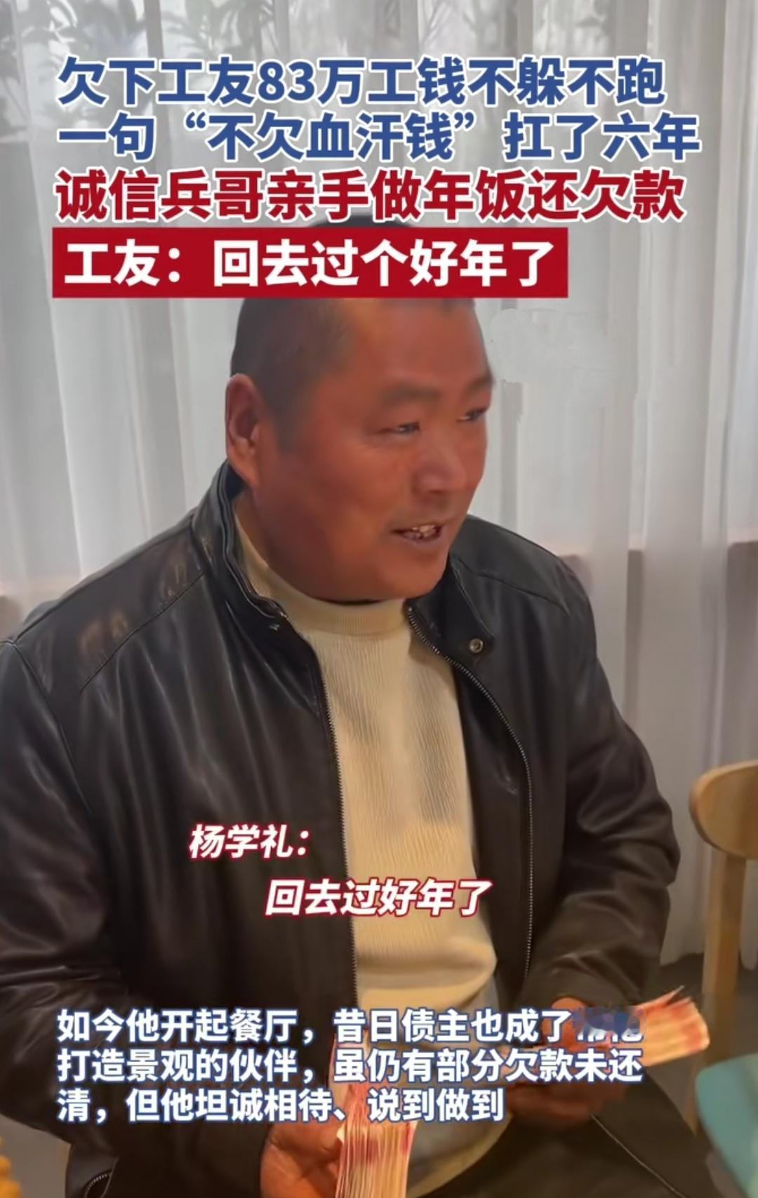 谁能想到一句承诺,能让一位退役兵哥扛了整整六年!襄阳这位兵哥曾因工程款问题,欠下两百多位工友83万血汗钱,一句“不欠血汗钱”,成了他六年来从未放下的执念。 为了兑现诺言,六年间他拼尽全力,打零工、开卤虾店,甚至抵押房车开餐厅,一点点攒钱还款,累计还了80万,硬是靠着自己的努力,慢慢还清了大部分欠款。 2026年春节,他终于结清了最后尾款,还亲手为工友们做了年饭。一桌热乎的年饭,一笔结清的欠款,藏着一位退伍军人刻在骨子里的诚信与担当,也让人心头满是温暖与动容。