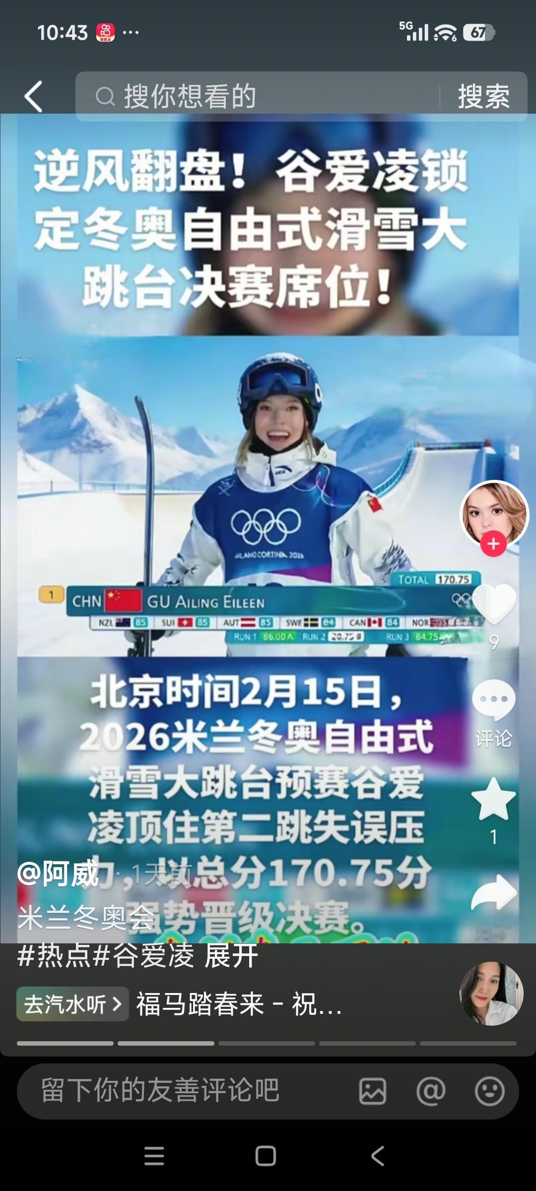 谷爱凌在U型场地技巧展现统治级状态,腾空高、转体稳、节奏丝滑,动作难度与完成度双双拉满。每一轮滑行都舒展利落、落地稳健,高分领跑毫无悬念。她以绝佳心态与过硬实力,诠释顶尖选手的绝对自信,成为赛场最亮眼的风景。期待决赛稳定发挥,再创佳绩,为国争光!