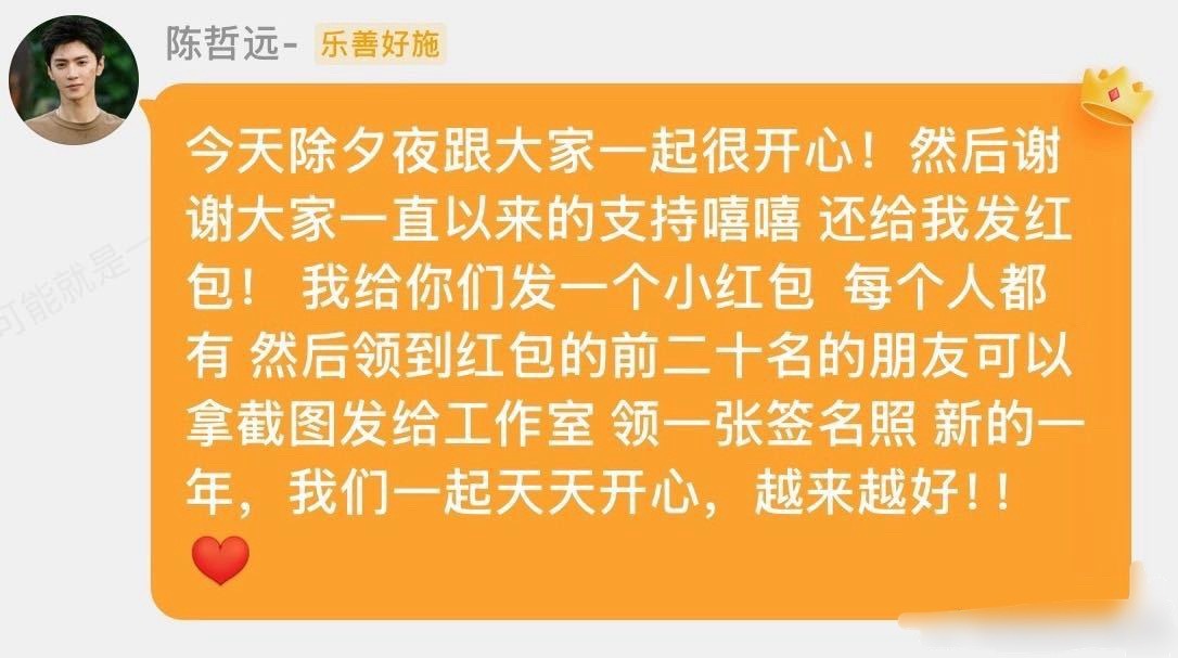 我的天额,陈哲远真的菩萨心肠,当他的粉丝好幸福,好哥哥,真心祝你马年什么都好。