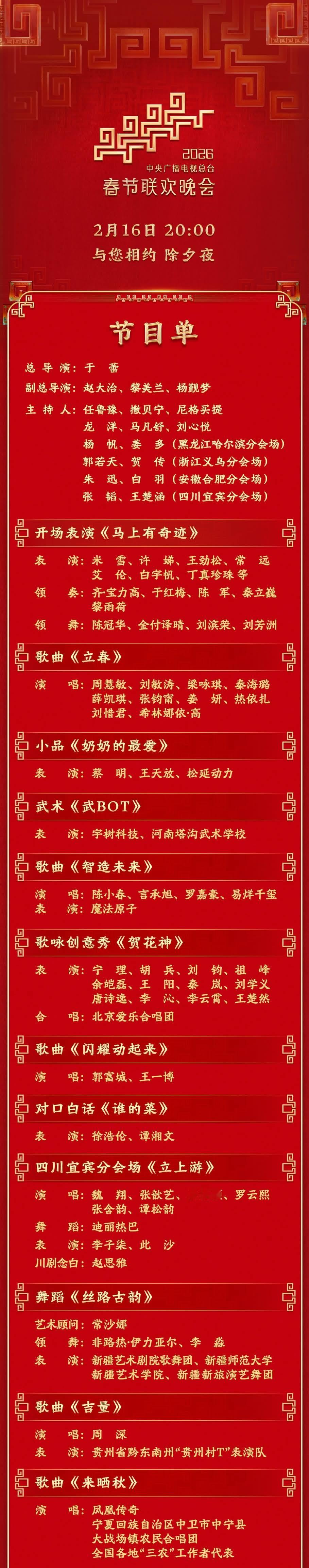 2026年央视春晚,科技+实力派,太牛了👍👍👍 中央广播电视总台《2026年春节联欢晚会》节目单发布,与全球受众共享年味,同庆新春! 在晚8点,中央广播电视总台《2026年春节联欢晚会》在央视10个电视频道,粤港澳大湾区之声、台海之声等9个广播频率,以及央视新闻、央视频、国际在线等6个自有新媒体平台同步直播。 目前春晚收视率最高的节目,就是王一博和郭富城两代舞王的合作舞台,真的是来炸场的。 王菲第六次登春晚, 演唱一首《你我经历的一刻》 非常正,另外周深也在春晚舞台封神!一开嗓就是顶级享受,嗓音的穿透力和感染力直接拉满,非粉都被狠狠震撼,实力真的太绝了。 最后,今晚春晚充满我们中国顶级的科技,春晚节目《贺花神》背后也使用了豆包Seedance2.0。当国风遇上AI科技,彷佛真“花神”降临。Seedance 2.0解决了特写镜头、微观变化、高审美水准带来的挑战,凭借高度逼真的细节生成控制,满足了春晚舞台对视觉效果的极致追求。Seedance 2.0还让多匹水墨宝马活了过来,保证马匹动作生动自然的同时,也维持了原作的力量感与节奏感。另外就是一年后,国产机器人从“蹒跚老奶”进化成武林高手了!一招一式太丝滑了!换作是十几二十年前,一定没人想到人形机器人最先取代的职业,是中国春晚表演的舞群,哈哈。 高sir为春晚点赞👍👍👍 春晚机器人中国功夫夯爆了王菲一开口时间都慢了四家机器人厂商春晚同台pk春晚机器人背后概念股或“爆火”机器人在春晚进化成宗师了
