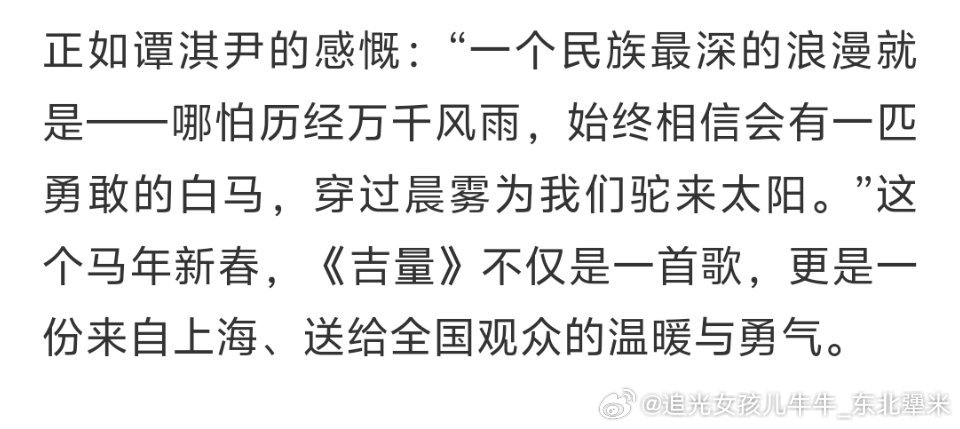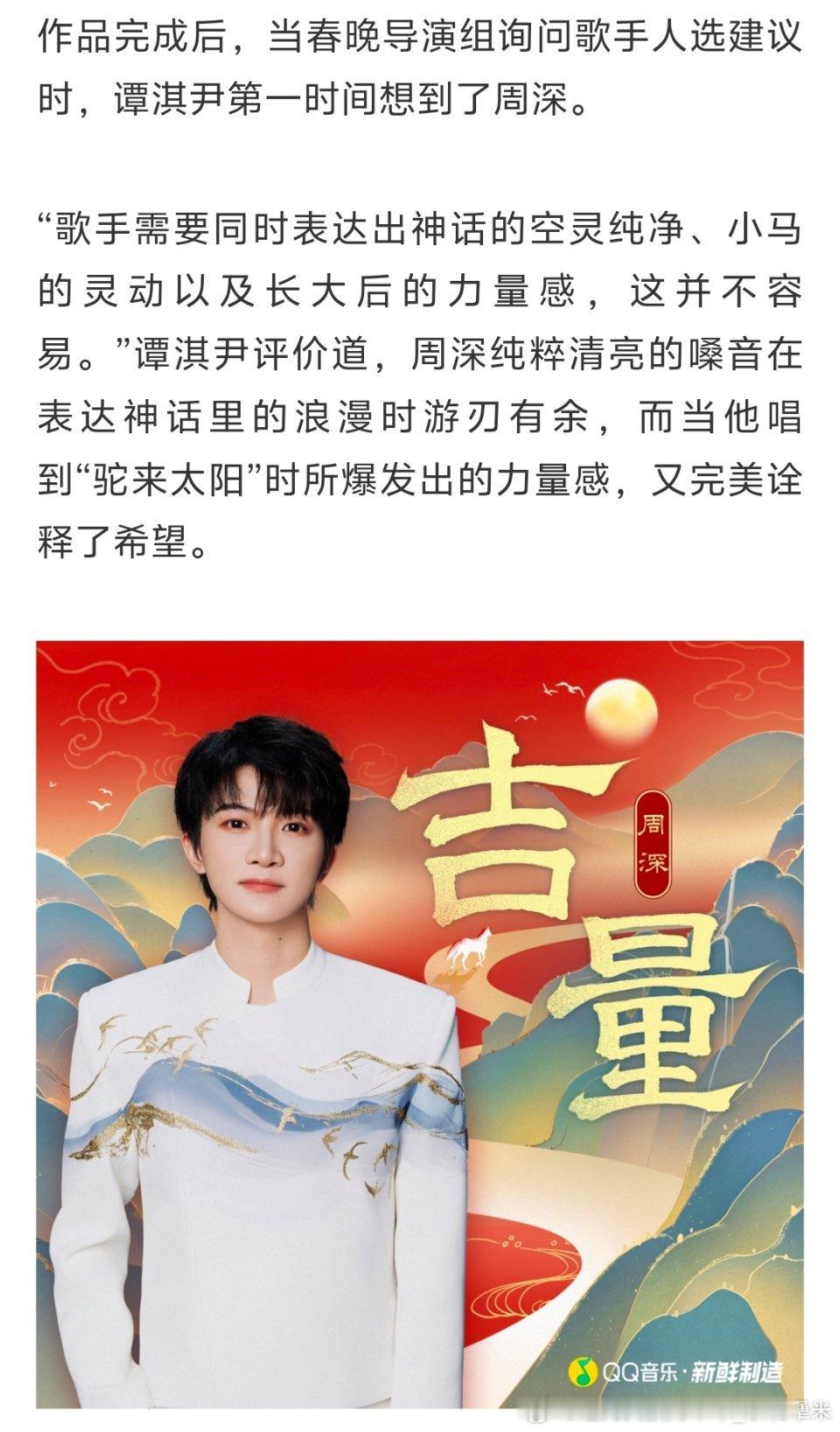 周深还得是周深周深唱的吉量也是脊梁 新民晚报记者采访了《吉量》的词曲作者谭淇尹!作品完成后,当春晚导演组询问歌手人选建议时,谭淇尹第一时间想到了周深。“歌手需要同时表达出神话的空灵纯净、小马的灵动以及长大后的力量感,这并不容易。”谭淇尹评价道,周深纯粹清亮的嗓音在表达神话里的浪漫时游刃有余,而当他唱到“驼来太阳”时所爆发出的力量感,又完美诠释了希望。
