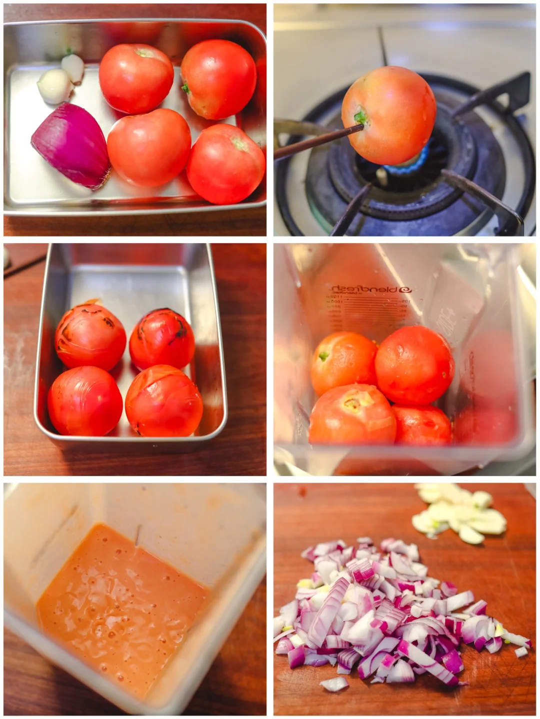 2.番茄250克,在火上烤一下去皮,放入料理机中打成汁。(这是1人份的番茄量哈)