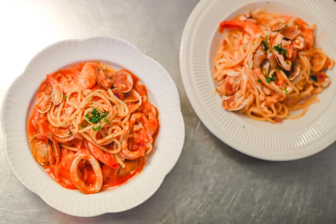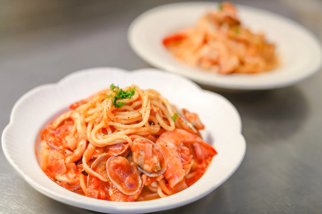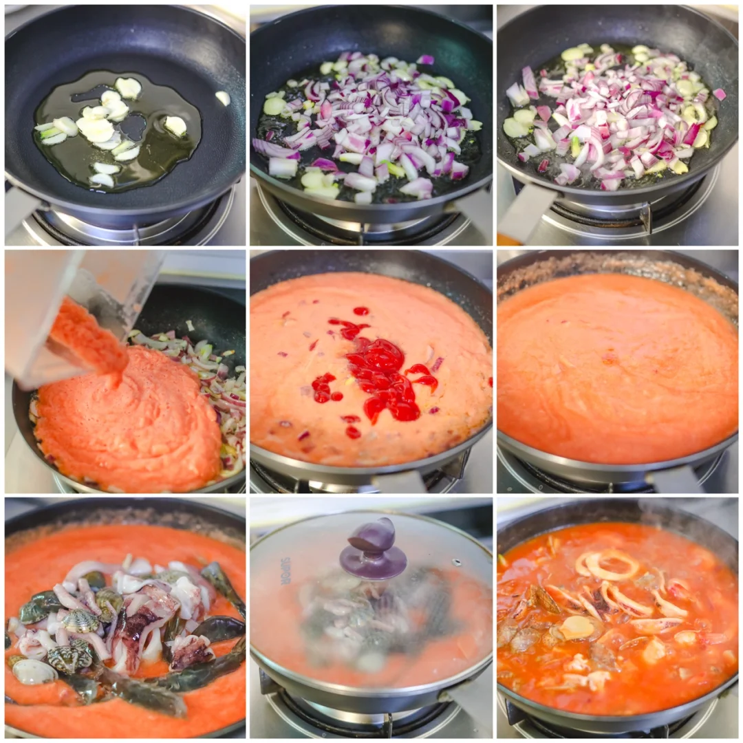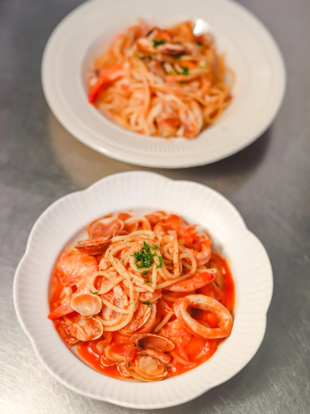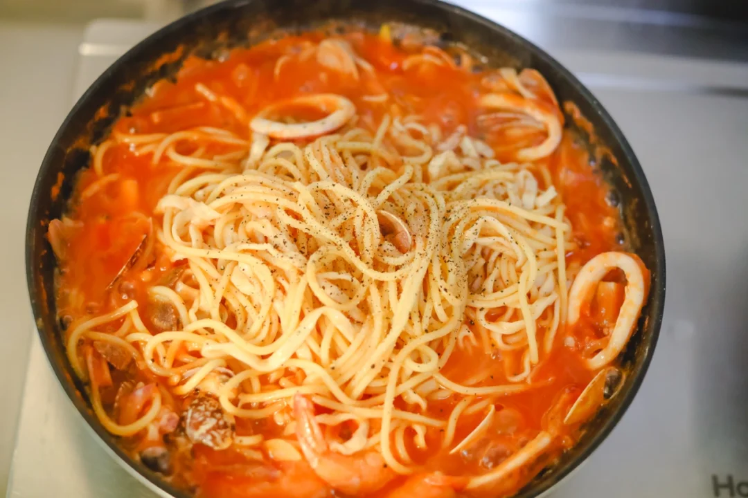洋葱/蒜片/鱿鱼/蛤蜊/大虾/番茄汁/蕃茄酱/意大利面