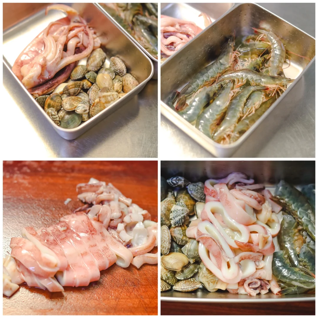 1.把买回来的蛤蜊清洗干净,大虾一定要新鲜活的,去除虾头,虾线和虾枪,鱿鱼切成小段。蒜切片,洋葱切成颗粒状。