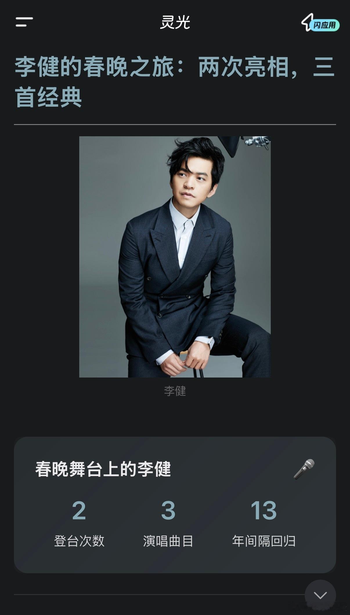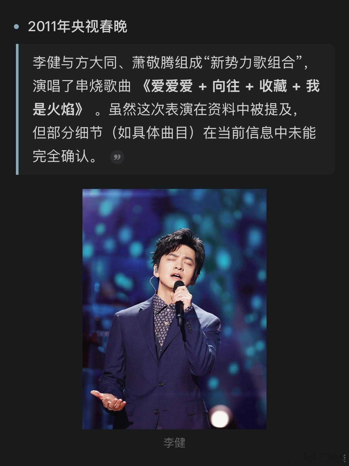 我的马年抓马之旅灵光带你去抓马在春晚节目单上看到李健,突然有些好奇,李健这些年上了几次春晚,唱了哪些歌。