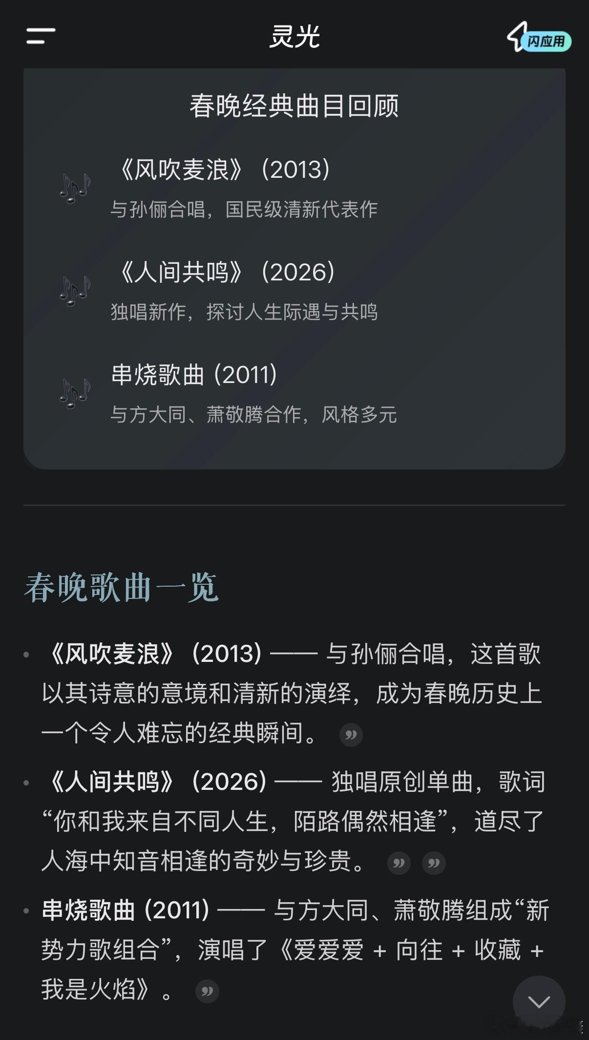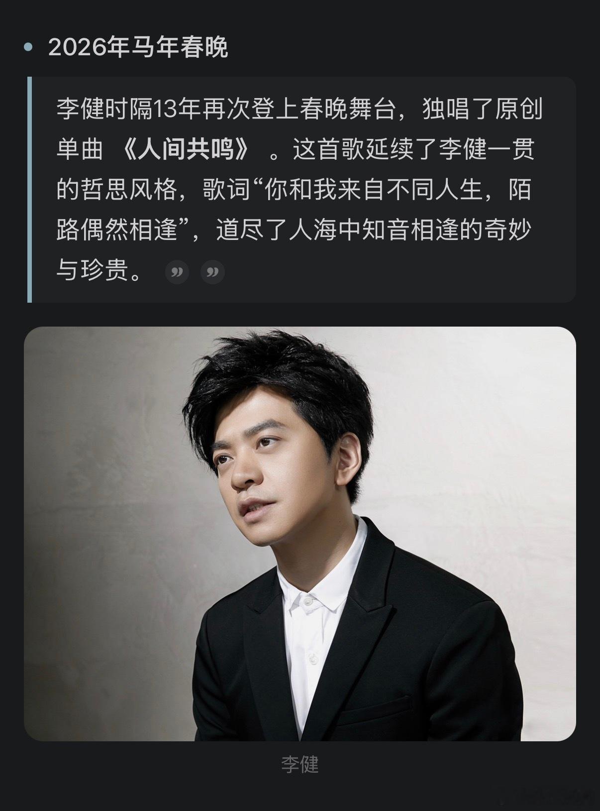 从2013到2026,正好13年。这13年里他上了《我是歌手》,成了「音乐诗人」,开了无数场演唱会,却一直没再上过春晚。现在回头看他这条春晚线——2011、2013、2026,三次登台,中间隔了那么长一段空白,反而让人觉得挺对味的。他不赶场子,不凑热闹,来的时候安安静静唱首歌,然后继续过自己的日子。