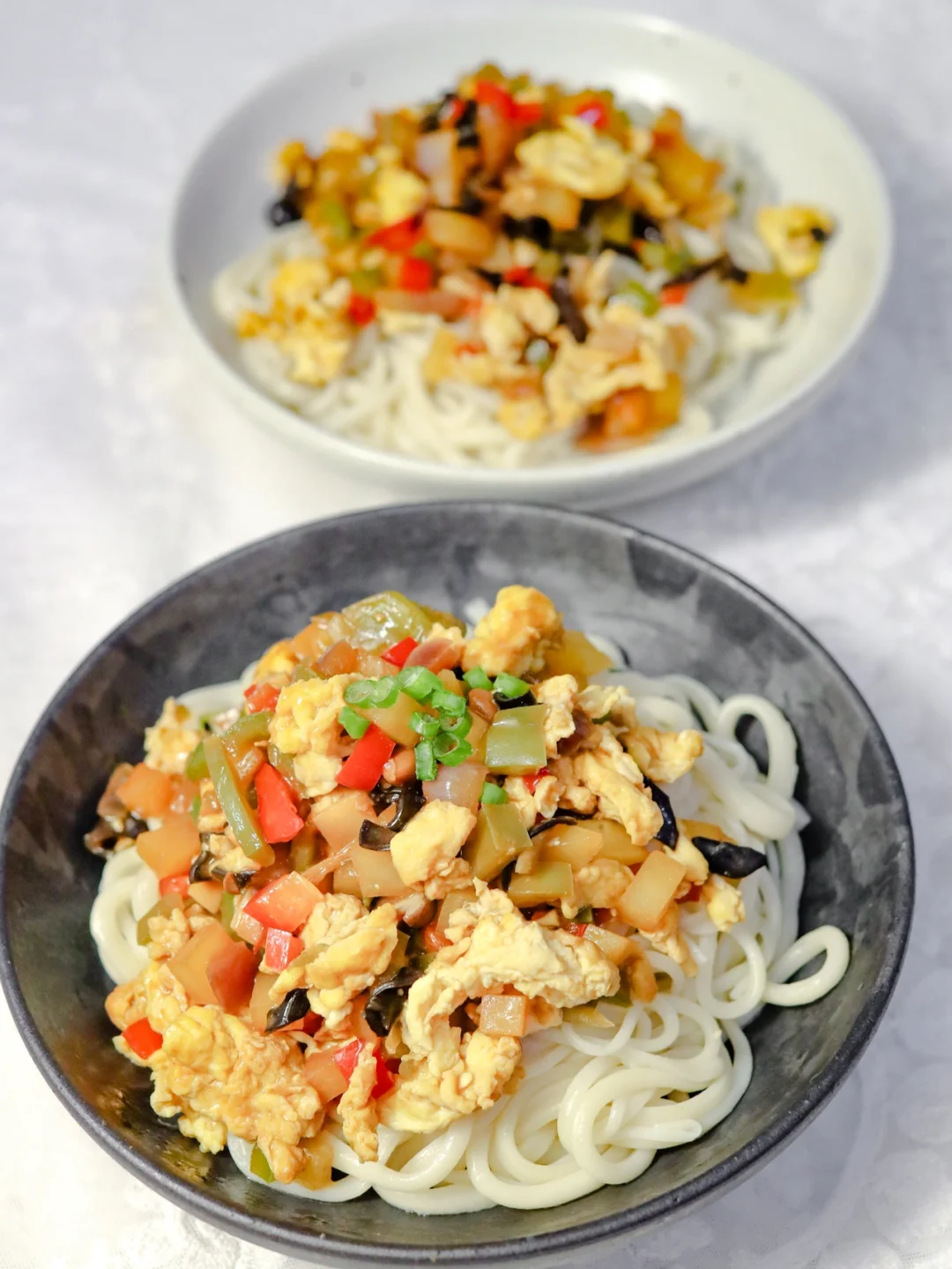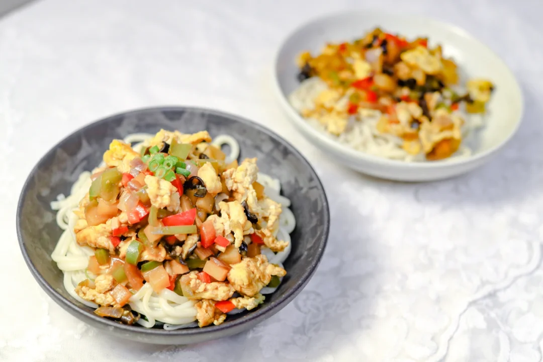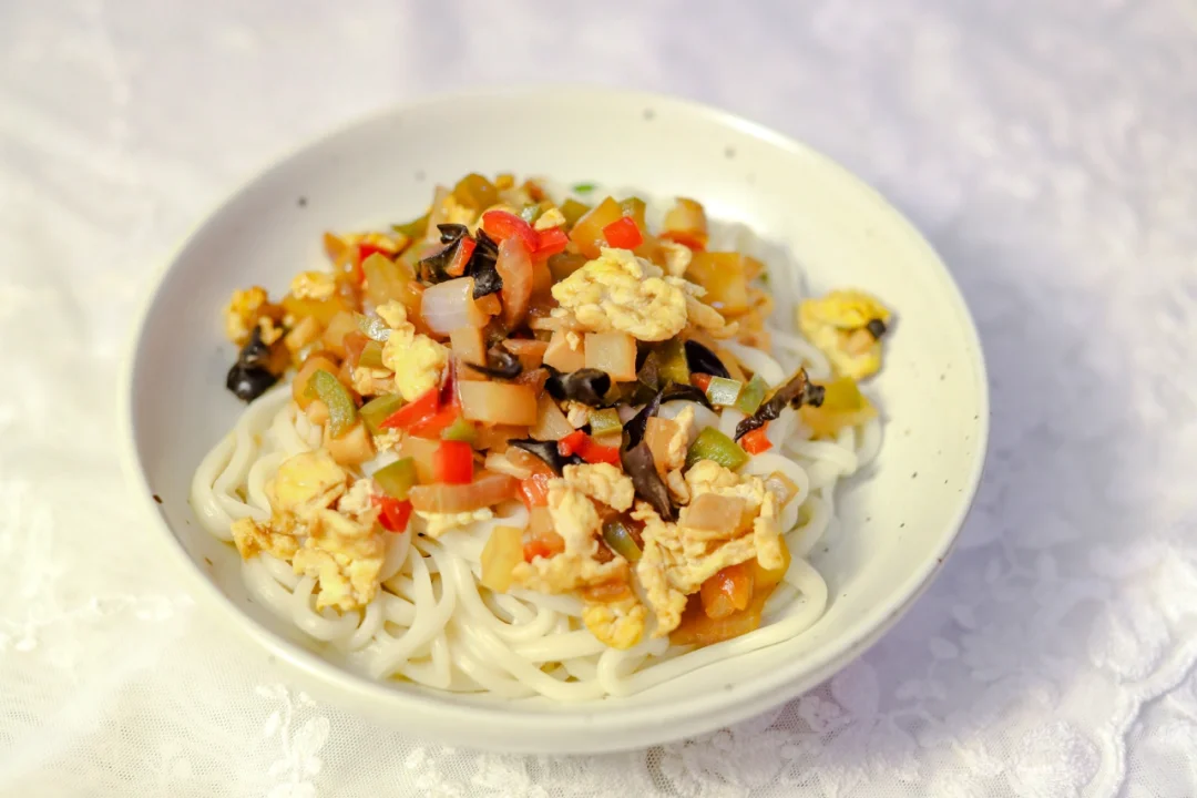 晚上做了手工拉面,做了加了蔬菜的鸡蛋酱,酱汁裹上面条,别提多好吃了~
