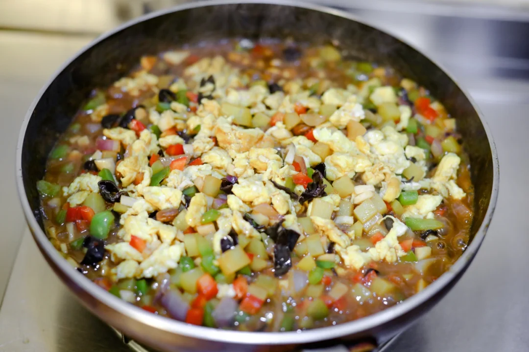 4.再次起锅烧油,加入洋葱丁儿炒香之后加入其它配菜,倒进去调好的酱汁,放入鸡蛋,转小火熬煮一会儿,待汤汁收浓稠即可。