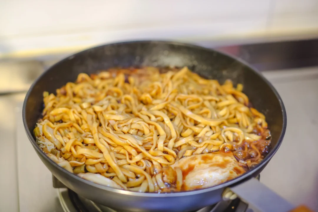 3.水滚之后加入荷包蛋,加入面条,盖上锅盖,中小火焖6分钟。