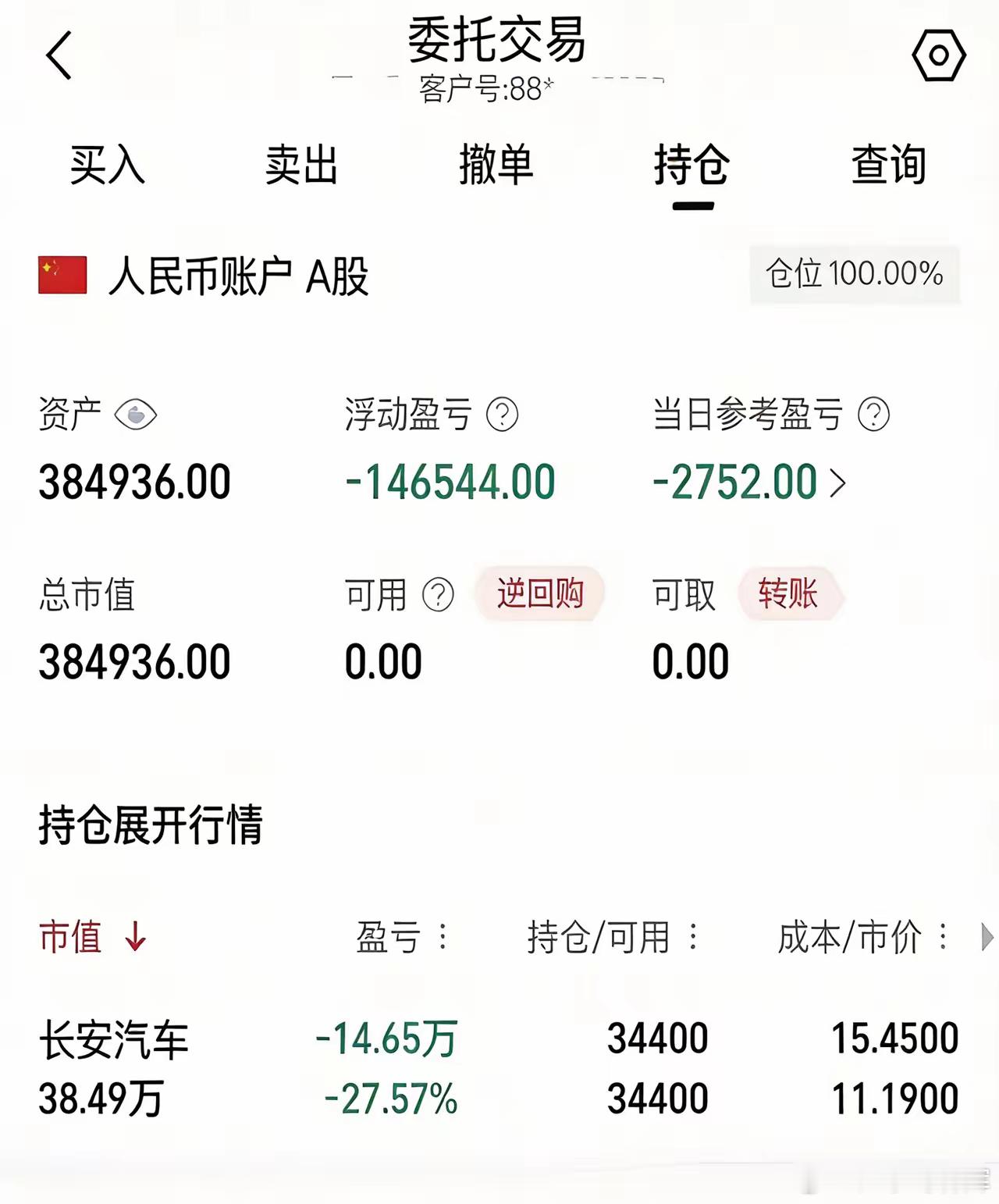 2024年,一位股民便已建仓长安汽车,此后股价一路调整,他不断补仓直至满仓,将最后一笔资金悉数投入,却始终没能等到股价真正回暖反转,行情只有短暂反弹,随后便再度回落。一次次满怀希望,换来的却是一次次更大的失望。目前他满仓持有长安汽车34400股,持仓成本高达15.45元,累计投入本金53.14万元。截至2月12日,账户已亏损14.65万元;以2月13日收盘价11.04元计算,亏损进一步扩大至15.2万元,整体亏损幅度达28.55%。曾经坚信的长线价值投资,在持续阴跌面前显得苍白无力,股息收入更是远远无法覆盖股价下跌带来的损失。这也让人不禁深思:在当下的股市里,究竟是坚守业绩基本面更重要,还是紧跟市场资金流向更关键?